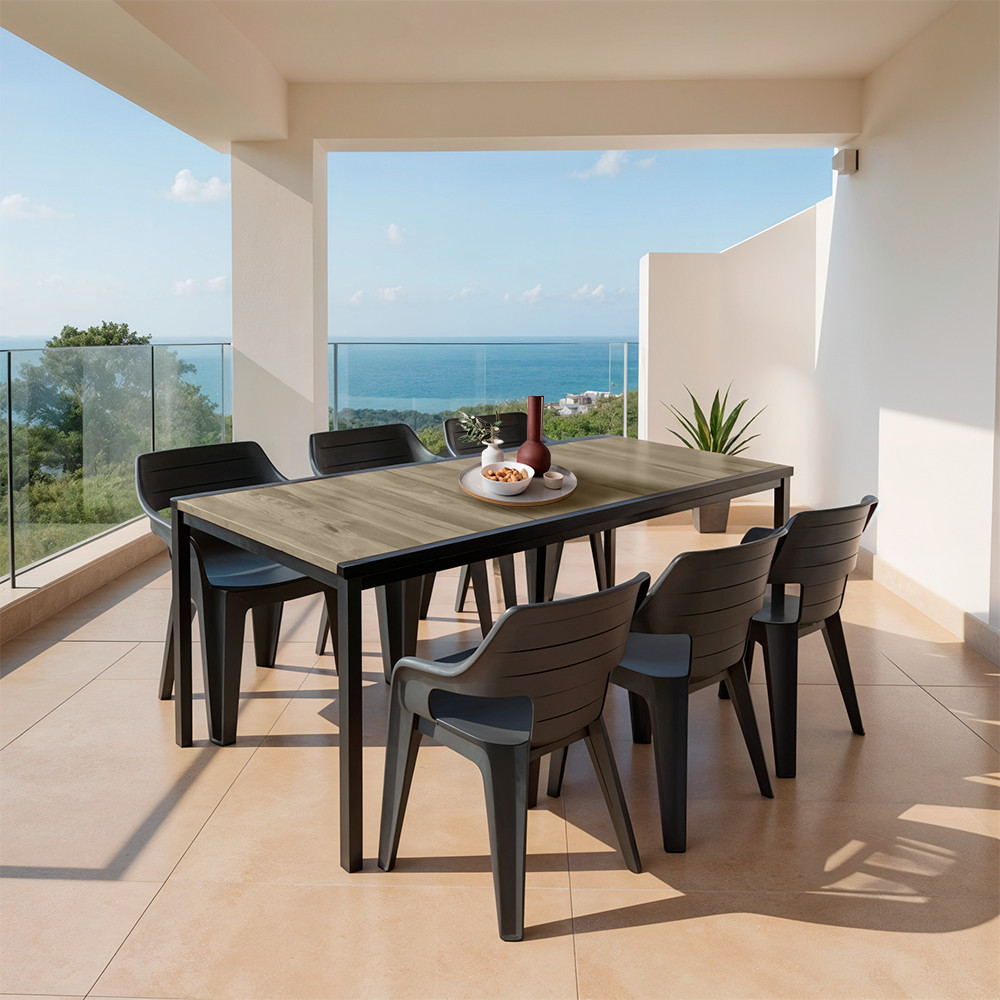 A meleg kőris tónusú asztallap és a letisztult fekete székek elegáns, kortárs megjelenést adnak. Legyen a teraszod skandináv, mediterrán vagy ipari hangulatú, a Ravello Large kifinomult középponttá válik.
