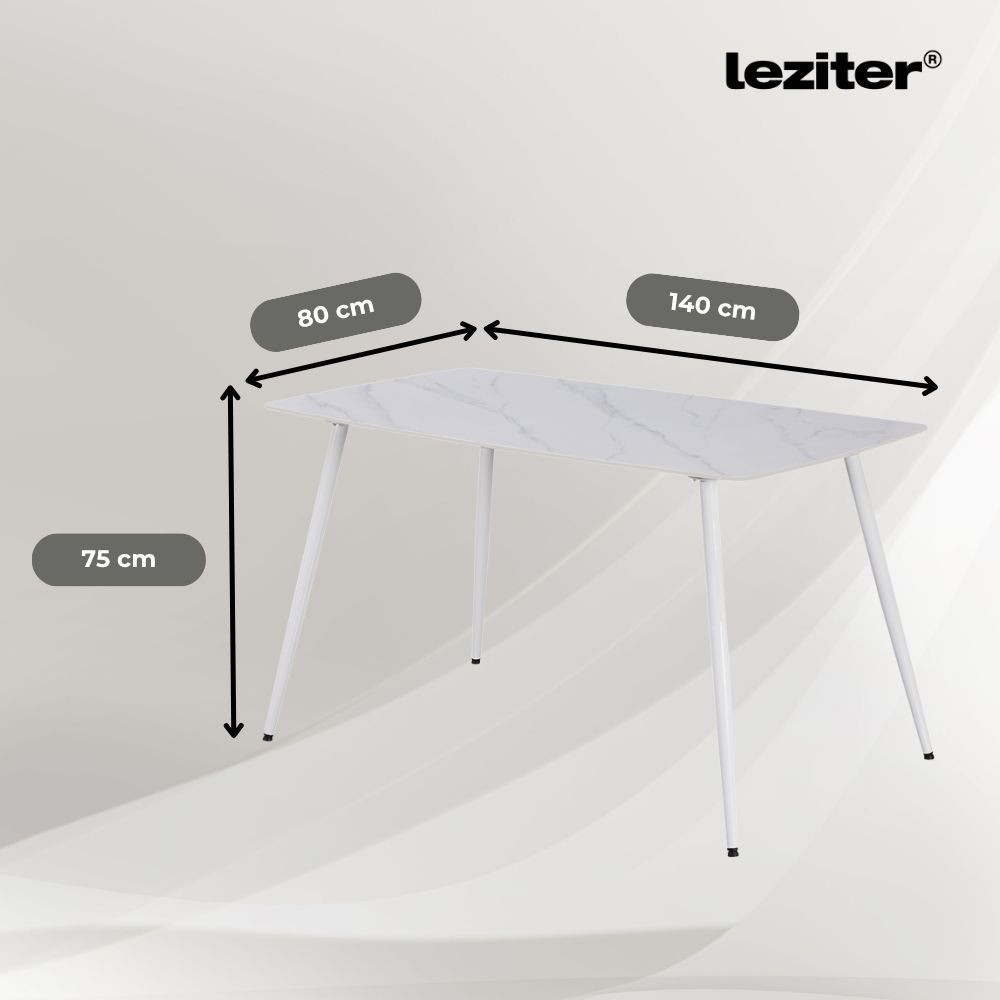 A szett központi eleme a Bora szinterezett kő étkezőasztal, amely 140x80 cm-es méretével kényelmes helyet biztosít 6 fő számára. Az asztallap modern technológiával készült, természetes anyagokból – agyagból és homokból – nagy nyomáson, extrém hőfokon égetve. Az eredmény egy hosszú élettartamú, karcálló, foltálló és hőálló asztallap, amely a mindennapos használat során is megőrzi szépségét. A fehérre festett fém lábak masszív stabilitást adnak, miközben letisztult, modern stílust sugároznak.
