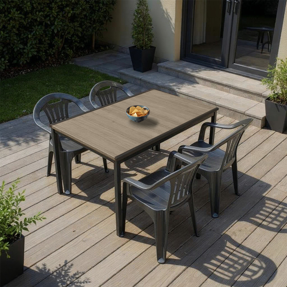 A prémium fröccsöntött polipropilén nem repedezik, nem rozsdásodik, nem fakul. A székeket kedvedre hagyhatod kint a perzselő napon vagy záporban – a Rowen garnitúra makulátlanul tűri a szélsőségeket. A Porto asztal DecoCoat™ fa-hatású felülete karc- és vízálló, a fekete acélváz pedig masszív stabilitást ad.