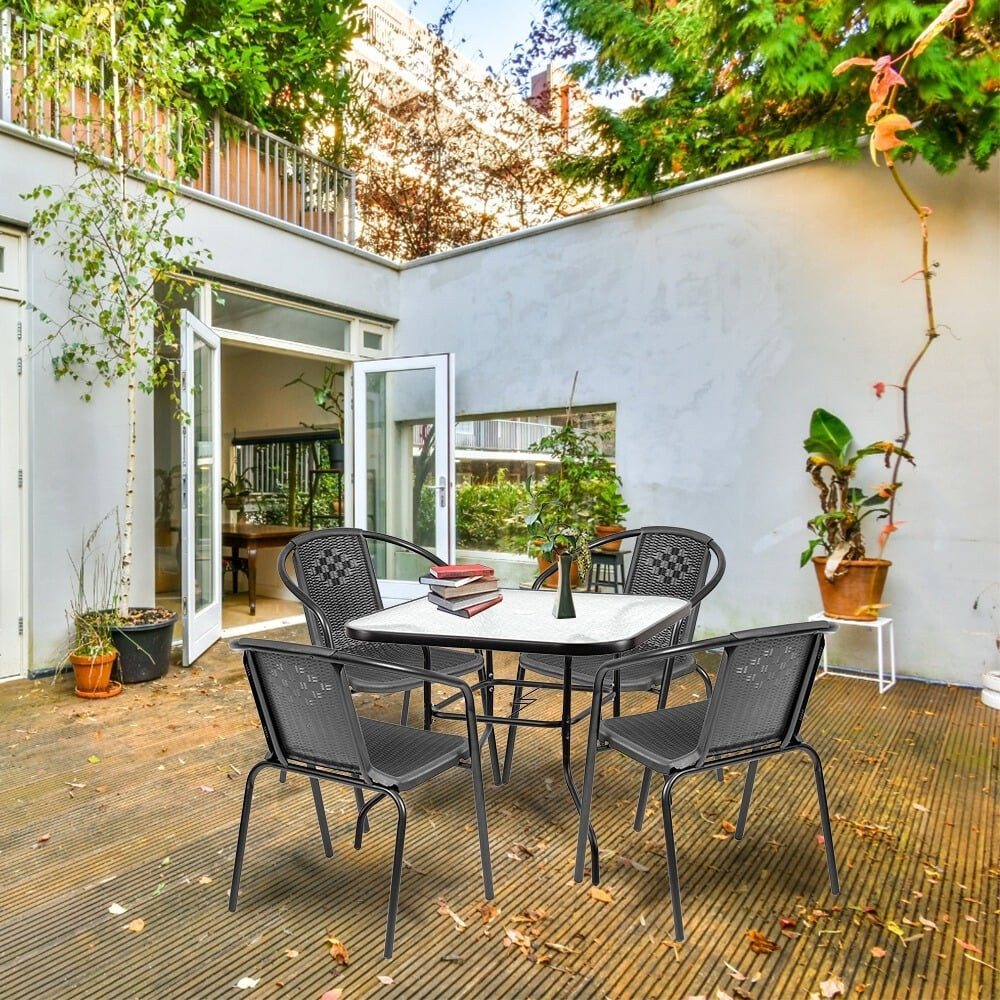 A modern kivitelű kerti bútorkészlet egy kerti üveglapos asztalt és 4 széket tartalmaz. A bútorokat 4 fő számára tervezték. A székek és az asztal lábazata acélból készül. Az asztallap 5 mm-es edzett üvegből készült, amely ellenáll a kisebb karcolásoknak. A műanyag szék ülésanyaga ellenáll az időjárási viszonyoknak. Előnye az ergonómikusan profilált ülés és karfa, amelyek tehermentesítik a vállakat pihenés közben.