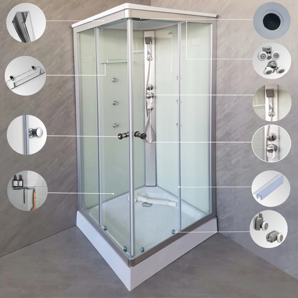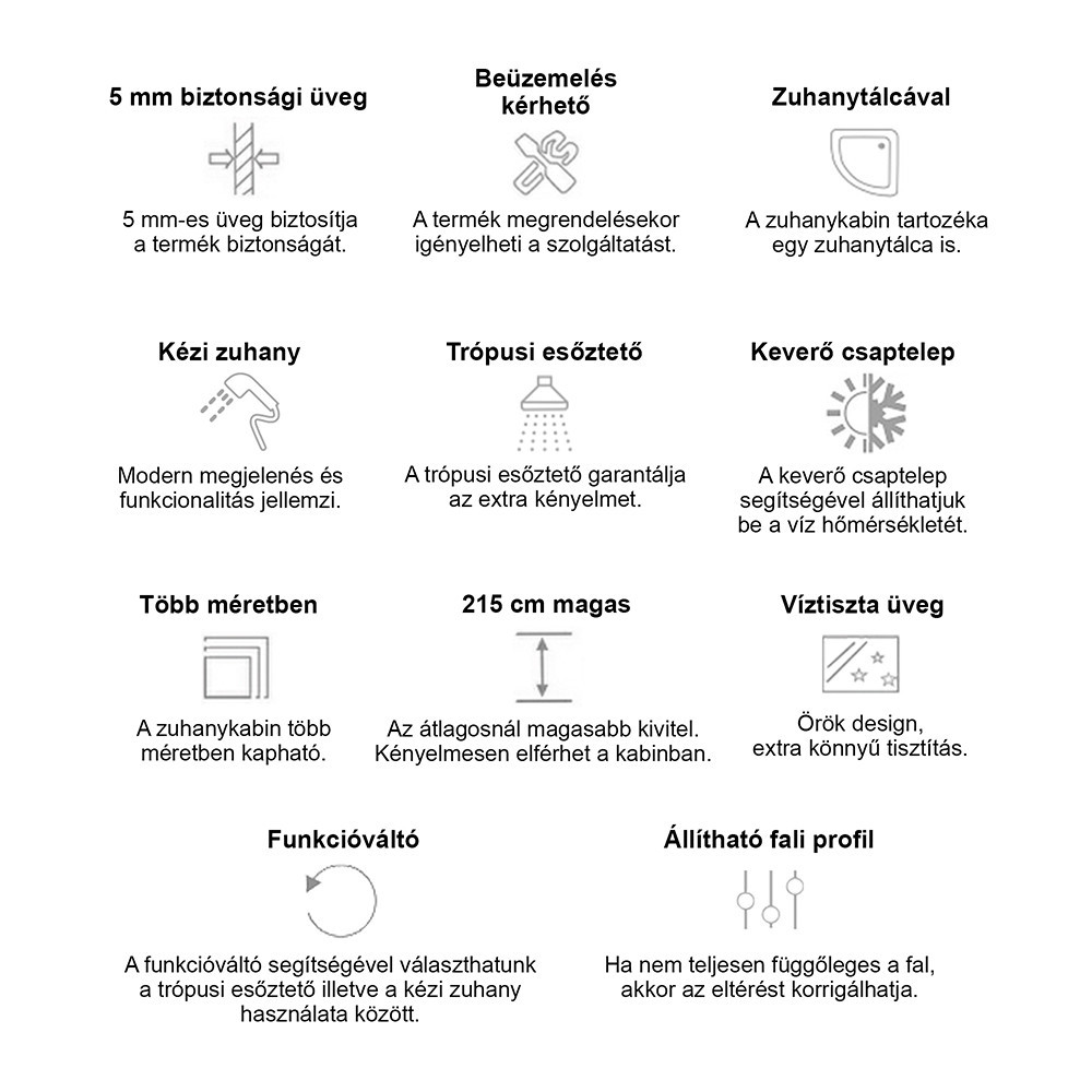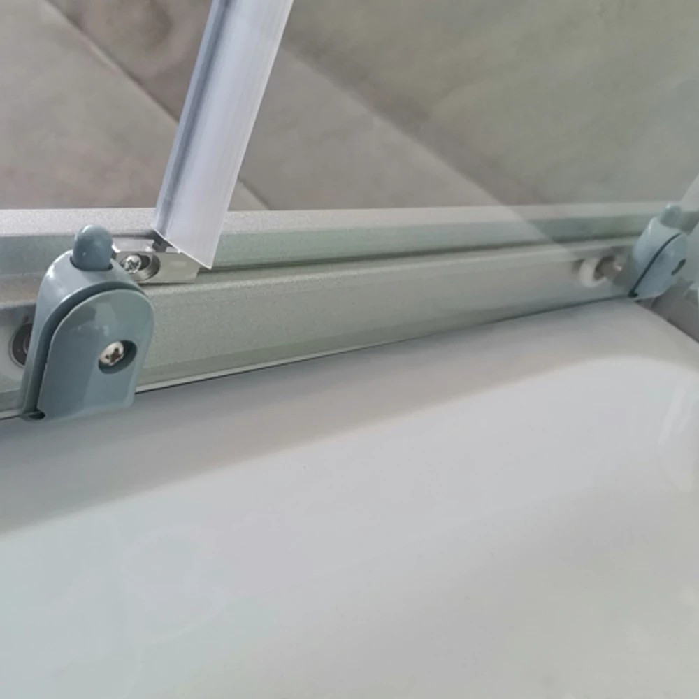 Az 5 mm vastag, edzett víztiszta biztonsági üveg elegáns megjelenésű, miközben ellenáll az ütődéseknek és hőmérséklet-változásoknak. Törés esetén apró, tompa szilánkokra esik szét, így családok számára is biztonságos. Az állítható alumínium fali profil lehetővé teszi a pontos illesztést még enyhén ferde falak esetén is, ezáltal ideális régebbi építésű otthonokba is.
