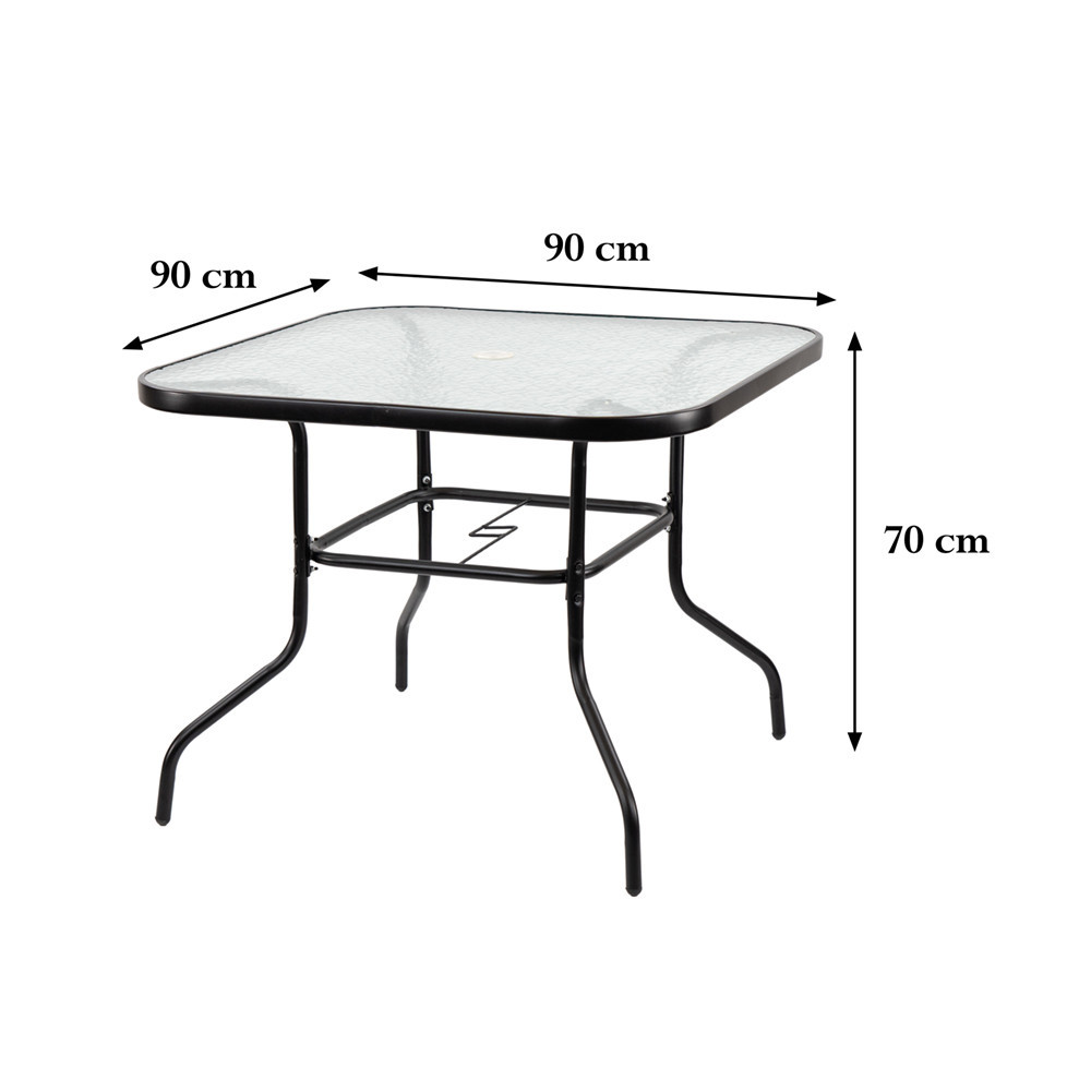 Az Vella fémvázas üveg kerti asztal stílusos és praktikus bútor, amely fémváz és átlátszó üveglap kombinációjával tökéletesen illeszkedik bármilyen kerti vagy teraszos környezetbe. Négyszögletes asztallapja és 90x90x75 cm-es mérete miatt ideális otthoni étkezéshez és szabadtéri összejövetelekhez egyaránt. A fémváz tartóssága és a könnyen tisztítható üveglap ideális hosszan tartó bútordarabbá teszi ezt az asztalt. A Vella tökéletes választás szabadtéri étkezéshez és szabadidős tevékenységekhez, lakossági és kereskedelmi használatra egyaránt ajánlott.