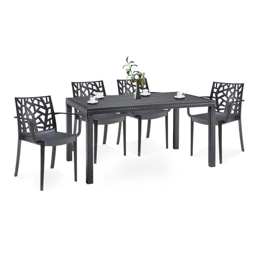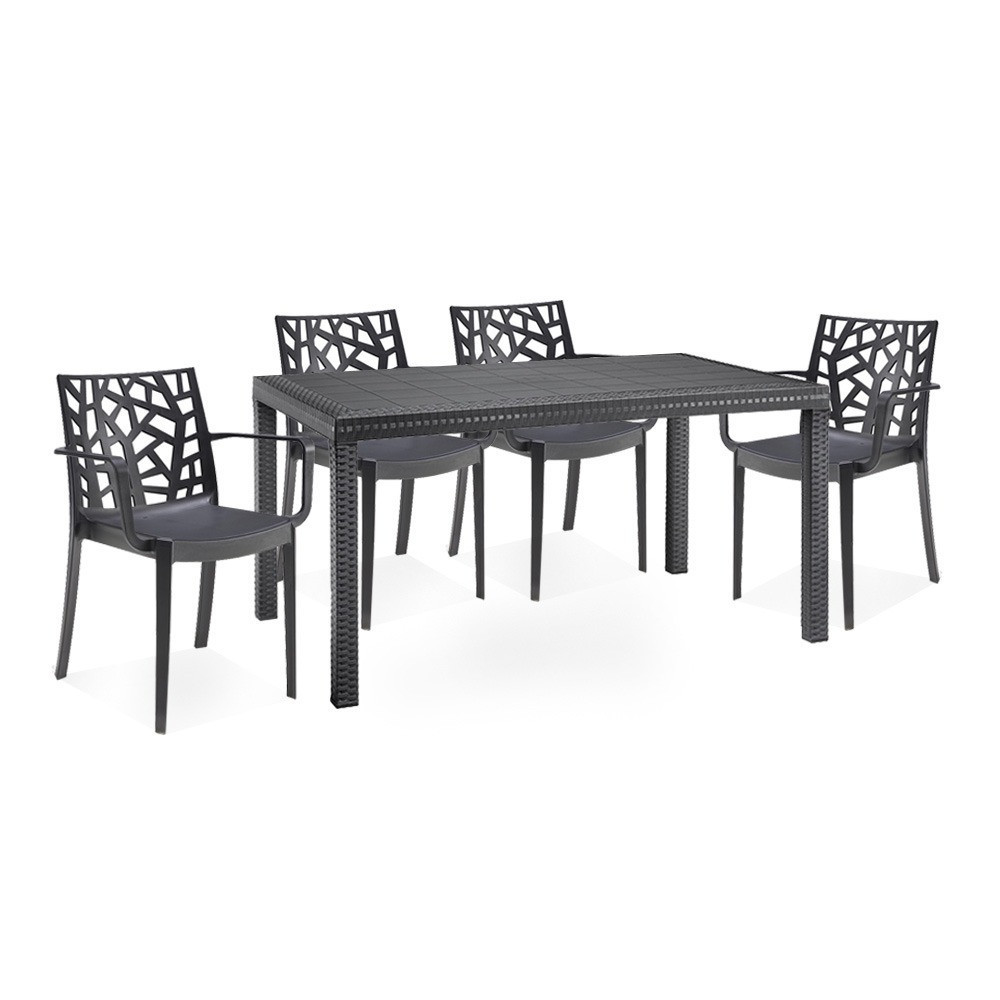 Ez a grafit színű, kényelmes és elegáns Violina bútor szett négy 55x 58x 82cm-es karfás széket és egy 90x 150x 74 cm-es négyszögletes magas asztalt foglal magába. Ez a 4 személyes kerti bútor garnitúra elegendő helyet biztosít az egész család számára, hogy a szabad levegőn tudjátok tölteni az időt. Nagyszerű választás, ha napközben szeretsz az udvaron pihenni és olvasgatni. Alkalmas családi összejövetelekhez.