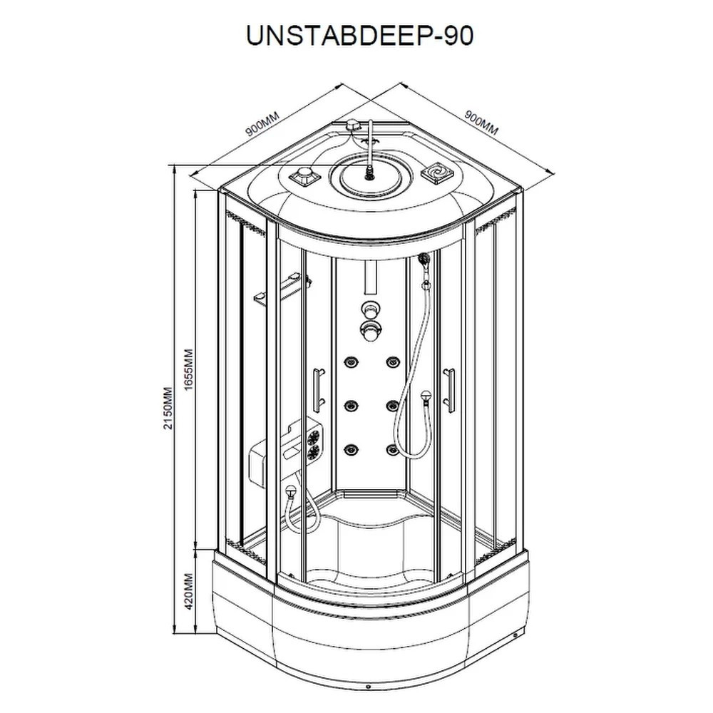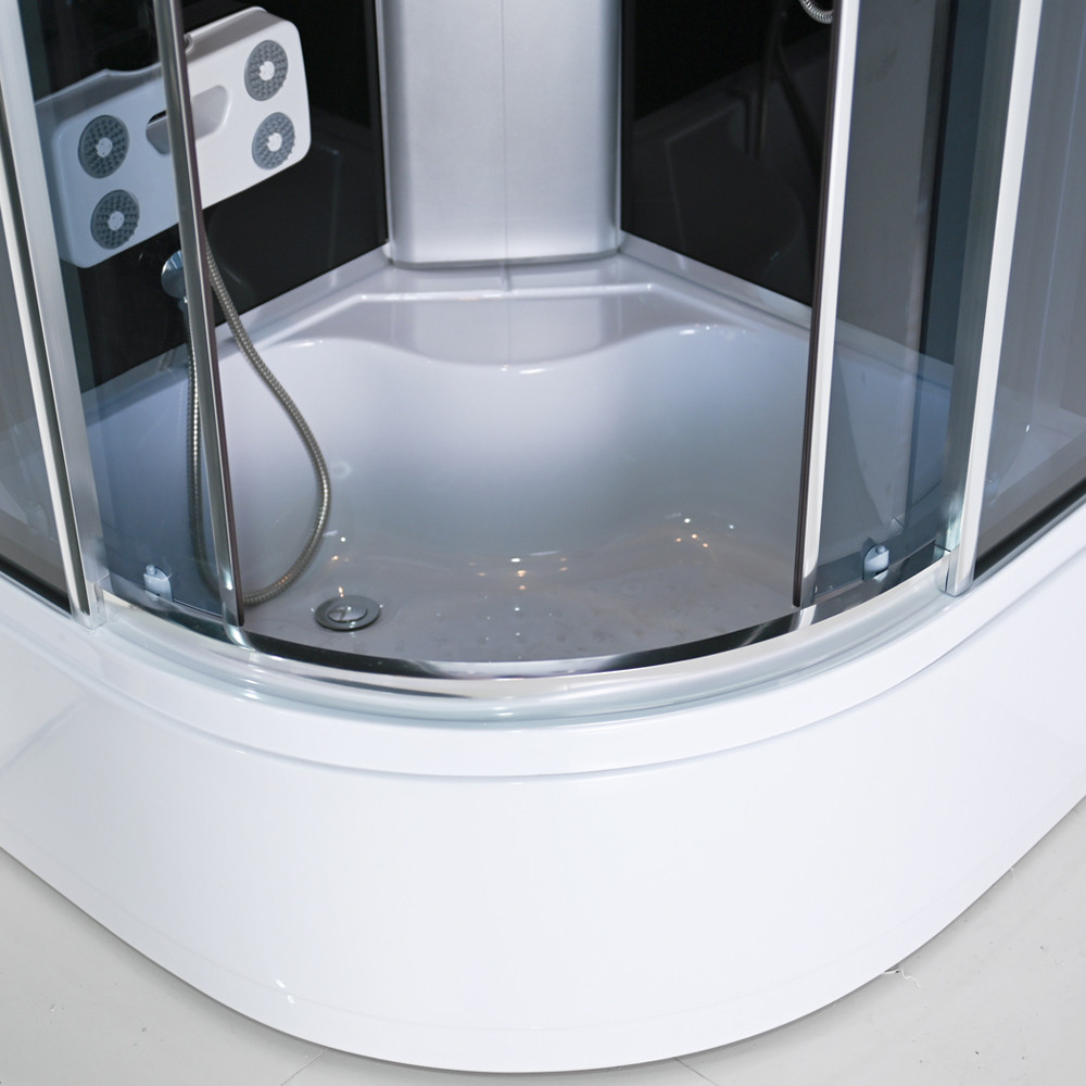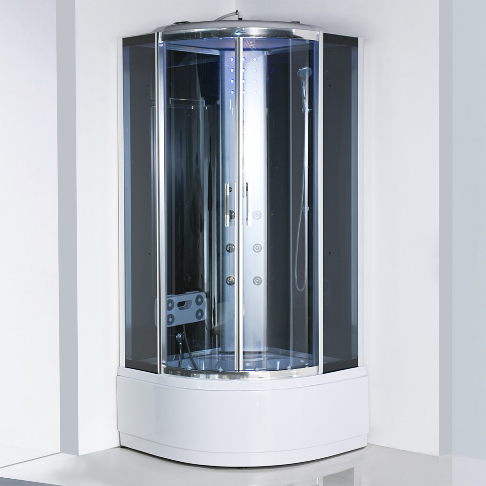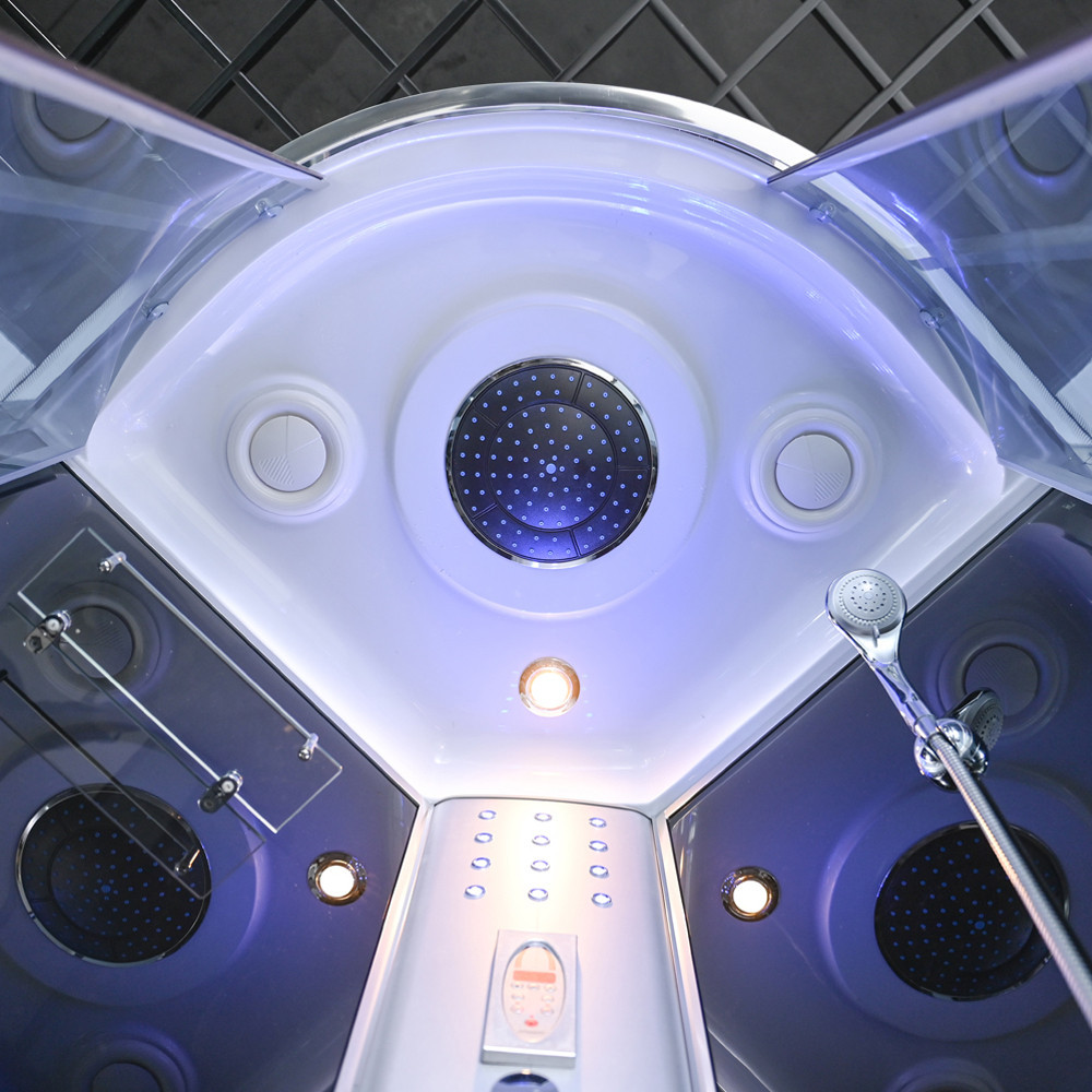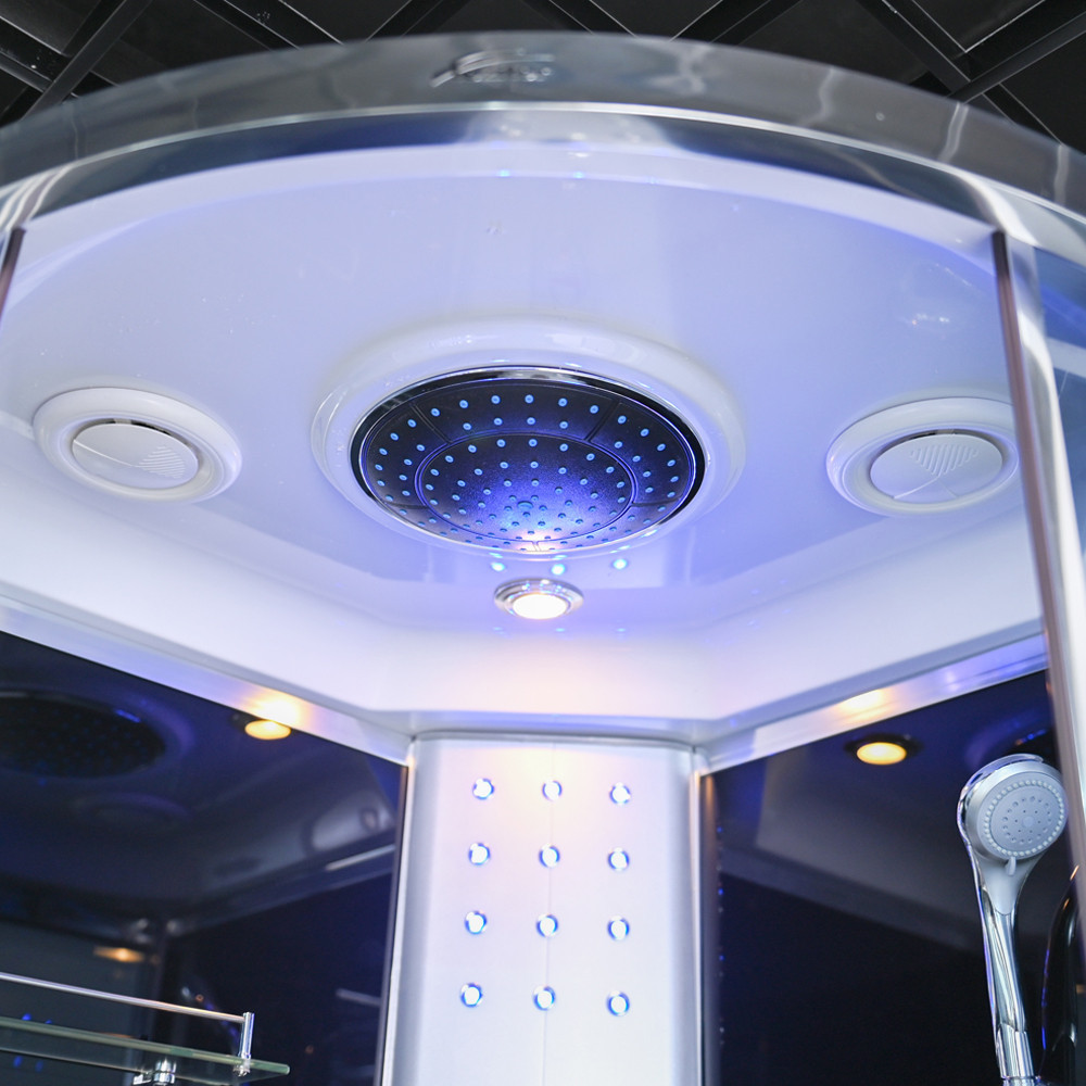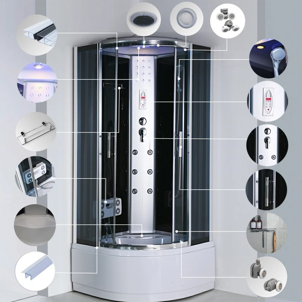 Zuhanykabin kényelmét fokozó eszközök: 6 hátmasszírozó fúvóka, alu hátsó panel, 2 zuhanyfej: esőztető fejzuhany, kézi zuhany, keverő csaptelep, funkcióválasztó kar, elektronika, kezelőpanel, rádió, hangszóró, hátsó és felső hangulatvilágítás, felső világítás, pipere polc, lábmasszírozó, ülőke.