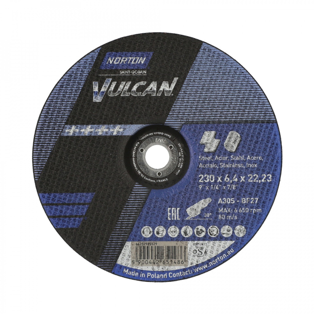 A Norton a tisztítókorongok legszélesebb választékát kínálja, amelyeket úgy terveztek, hogy megfeleljenek az ipari vásárlók minden igényének. A Vulcan tisztítókorongok optimális teljesítményt és jó ár-érték arányt biztosítanak minden acél, rozsdamentes acél, öntöttvas és kő alkalmazásban. A Vulcan tisztítókorongok számos iparágban használhatók, beleértve a repülőgépgyártást, az autógyártást, az öntödéket, a fémgyártást, a hajógyártást és az általános építőiparban. Alkalmas kis teljesítményű gépekkel való munkavégzéshez. Közepes minőség közepes és kemény acélhoz. Az éles alumínium-oxid szemcsék gyors anyageltávolítást tesznek lehetővé fémipari sorjázások, hegesztési varratok megmunkálása, egységes felület kialakítása, szerszámacél és szerkezeti anyagokon. Szennyezőanyag-mentes összetétel.