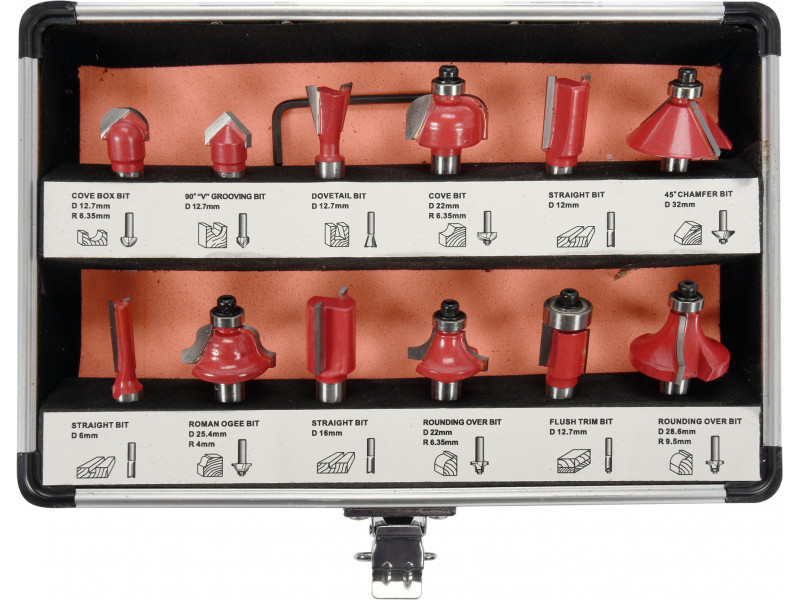 Egy 12 darabos marószerszám készlet faipari munkákhoz. 8 mm-es vágási mélységű vágólapok, YG6X jelzésű volfrám-karbidból készült. A készlet hat csapágyazott végű marót tartalmaz, amelyek megkönnyítik a munkát. Ezüsttel forrasztott marók, 0,08 mm-es mérettűrés. Fa- és faalapú anyagok megmunkálásához 8 mm-es marógéppel. 12 db, imbuszkulcs - 1 db Használati figyelmeztetések: Figyelem! Mindig használj személyes védőfelszerelést munka közben.