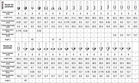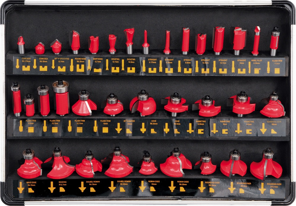 Pontosan készített, nagysebességű fa marószerszámok. 8 mm-es szár, profilozott vágólapokkal felszerelt fejek, yg6X szilícium-karbidból készült. Ezüst forrasztott, 0,08 mm-es mérettűrés. Az él megmunkáló marószerszámok csapágyakkal vannak felszerelve a marógép kezelésének megkönnyítésére. 35 marószerszámot tartalmazó készlet, melyet egy funkcionális bőröndben gyűjtöttek össze, melynek üvege megkönnyíti a ellenőrzést és a megfelelő szerszám gyors kiválasztását. Fa és néhány műanyag pontos megmunkálására használható bányász marószerszámokkal. Felhasználási figyelmeztetések: Figyelem! Munka közben mindig használjon személyes védőfelszerelést.