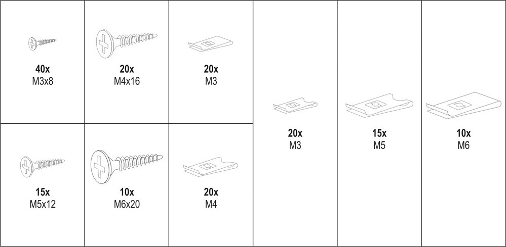Egy 170 darabos csavarok és testbetétek készlet. A készlet M3x8 mm-től M6x20 mm-ig csavarokat és betéteket tartalmaz. Az egészet egy praktikus 'osztó' csomagolásban helyeztük el.
