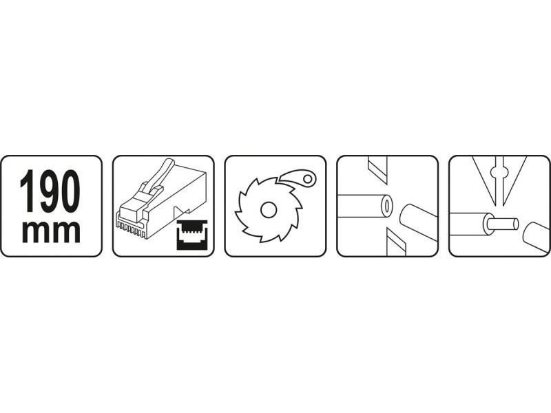 YT-22442 fogó ráccsal a telefon és hálózati végződések préseléséhez. A fogó szénacélból készült, amelyet oxidációs folyamatnak vetettek alá, így védelmet nyújt a korrózió ellen. Két komponensű műanyag fogantyúk. A keményebb PP komponens szorosan tapad a testhez, míg a TPR külső rész kellemes tapintású és csúszásgátló tulajdonságokkal rendelkeziklehetőség a telefon végződések RJ11, RJ12 préseléséreképes az RJ45 hálózati kábelek végződéseinek préseléséreképes gyorsan lehúzni az izolációt a CAT kábeleknek jellemző átmérővelképes a kábel vágására Használati figyelmeztetések: Figyelem! Mindig használjon személyes védőfelszerelést munka közben.