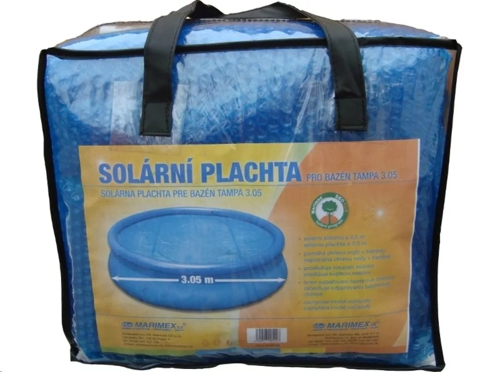 A Marimex kék szolár ponyva 2,5 m vízszint átmérőjűmedencék számára polietilén hőszigetelő anyagból készült. A ponyvában lévő buborékok lencsékként működnek és felmelegítik a vizet a napsugárzás segítségével. A hőszigetelő anyag ráadásul lassítja a víz kihülését éjszaka.