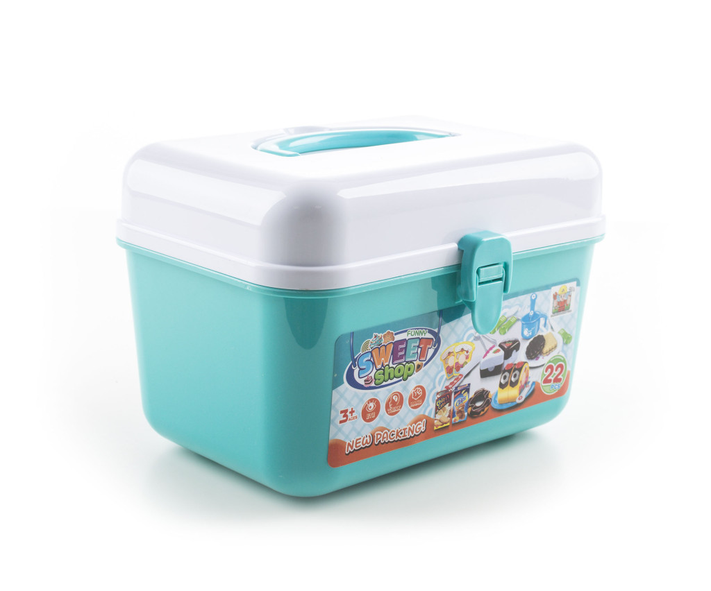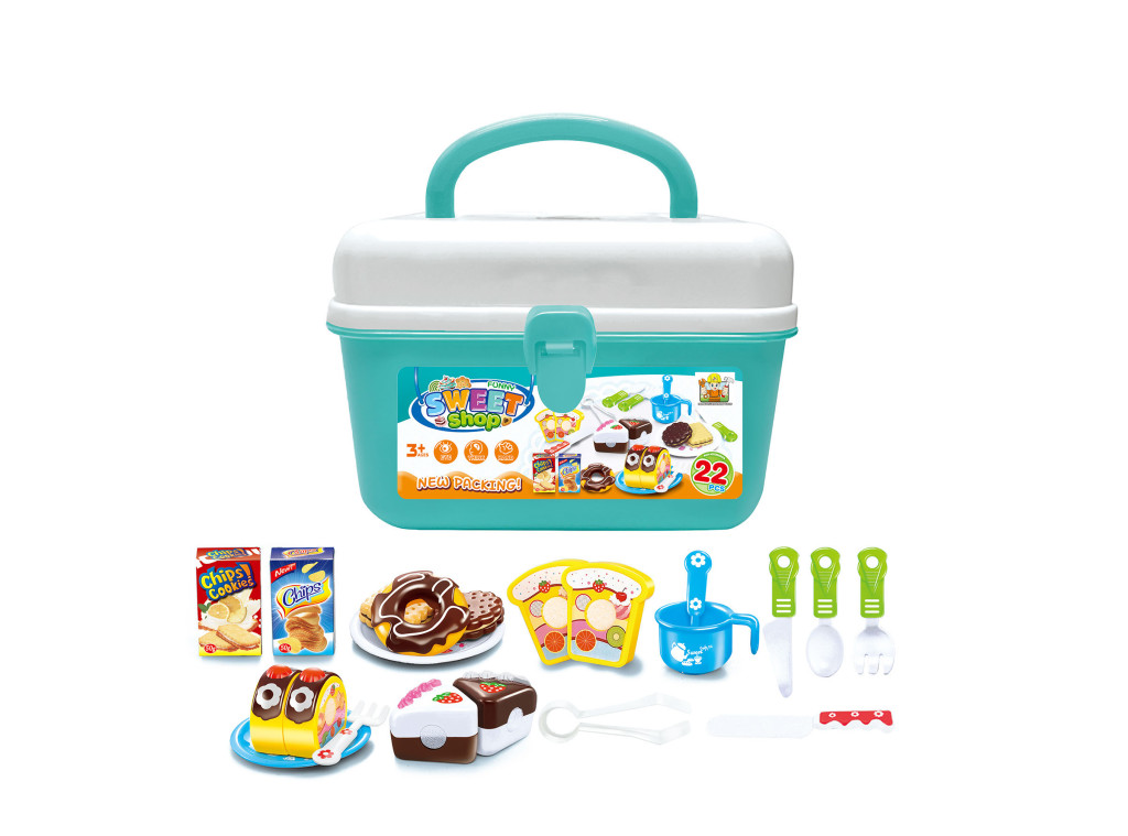 A kofferben gyönyörű színes műanyag tortákat, fánkokat, tekercseket, dobozokat alapanyagokkal, edényeket és evőeszközt talál. Egyszóval mindent, amire a cukrászdában szükség van. A koffer része egy