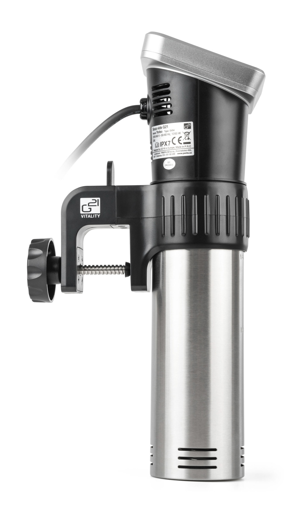 A G21 Trofeo merülő lassúfőző 1 200 W teljesítményével a sous-vide vákuumfőzés igazi mestere. Készen áll a hétköznapi biztonságos használatra és a legapróbb részletekig kifinomult. A karcsú test két részből áll - a merülő rész belső főzőspirállal és a felső rész elektronikával és kerek érintőképernyővel. Ahhoz, hogy a G21 Trofeo sous-vide főzőt biztonságosan felakaszthassuk a főzőedény szélére, a merülőfőzőt egy csúsztatható rögzítőkapoccsal láttuk el.