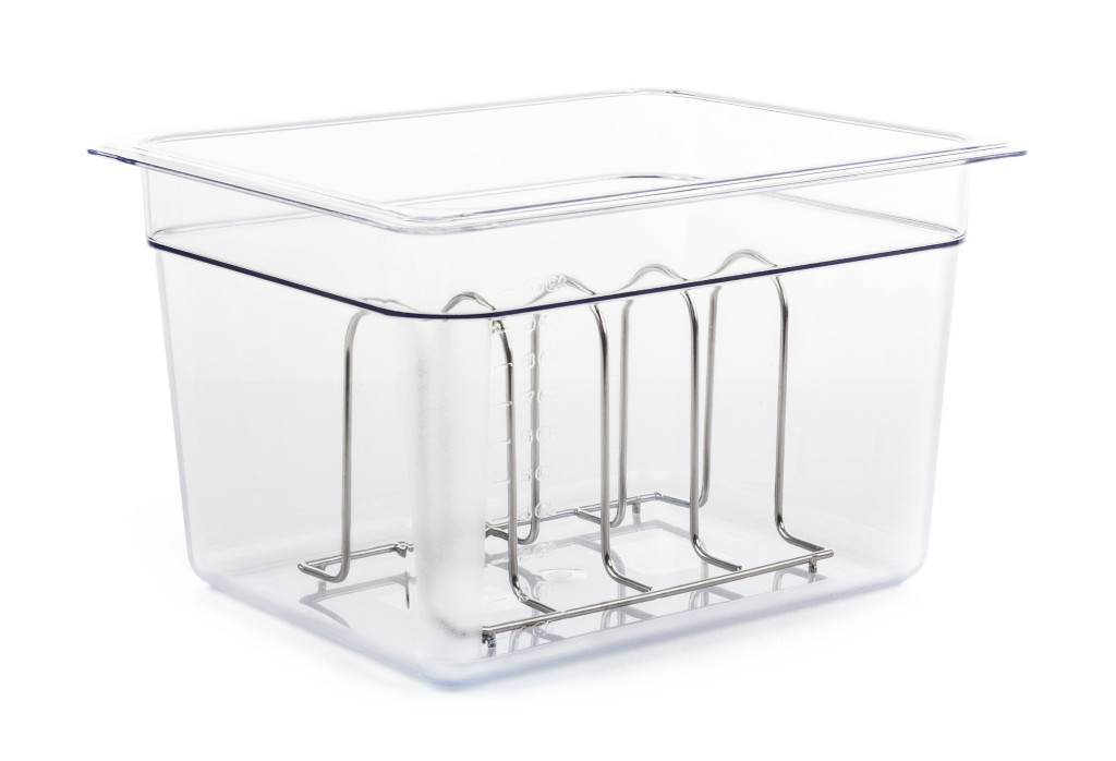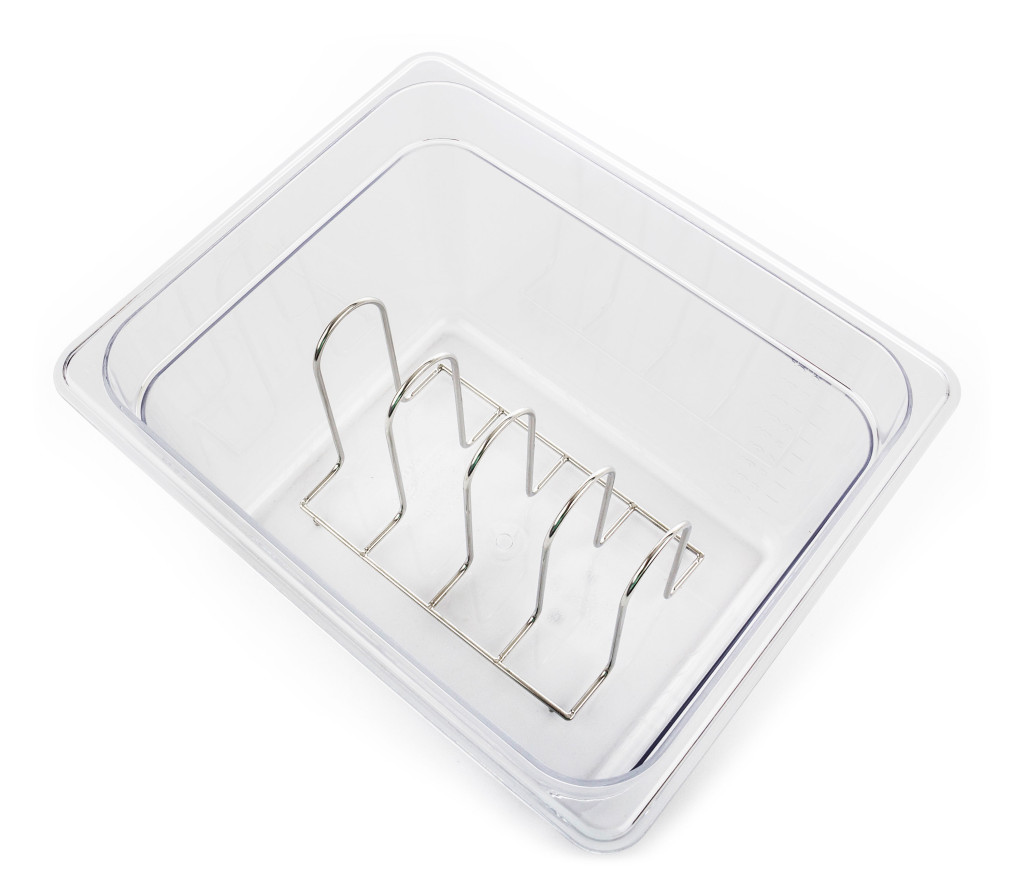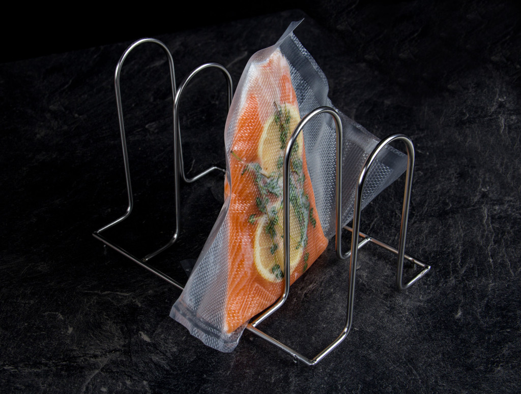 Próbálja ki a praktikus kiegészítőnket a sous-vide főzéshez. A 4 férőhelyes állvány a sous-vide főzés alatt stabilan tartja a vákuumcsomagolt hús és más alapanyagokat.