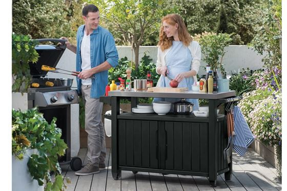 A grafit Unity XL Keter grillasztal kapacitása 207 liter. A rozsdamentes acél munkalap, a praktikus fogantyú akasztóval a törölközők felakasztására és az asztal mozgatására szolgáló kerekek tökéletes segítség a kültéri grillezéshez.