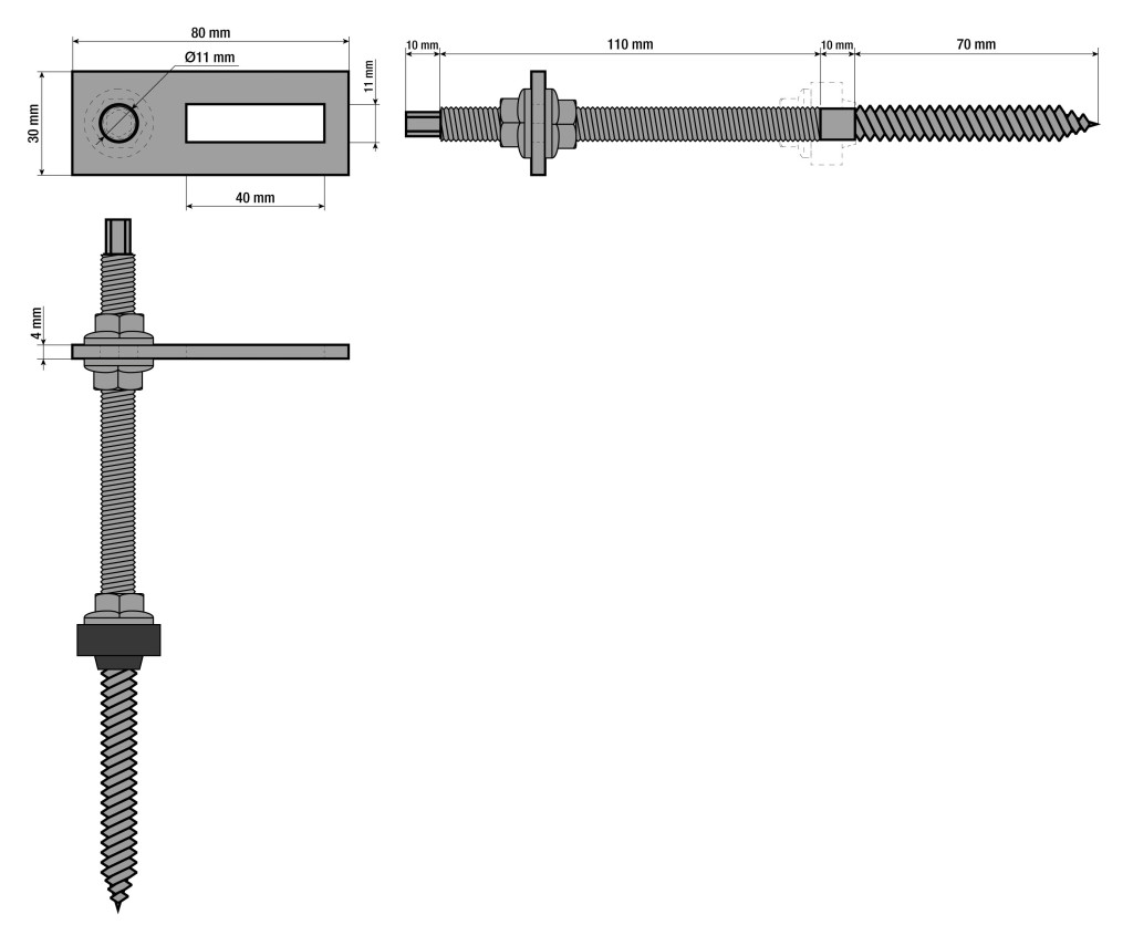Tőcsavaros tetőkampó, menet mérete: M10 x 200 mm, alkalmas a szerelősínek rögzítésére hullámos tetőre, rozsdamentes acél és horganyzott vas, lefogató méretei: 80 x 30 x 4 mm.