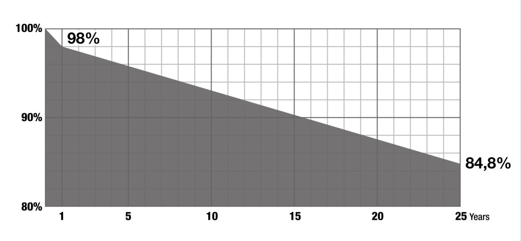 Garantáljuk a napelem teljesítményét egészen 25 évig a 84,8 % teljesítményt.