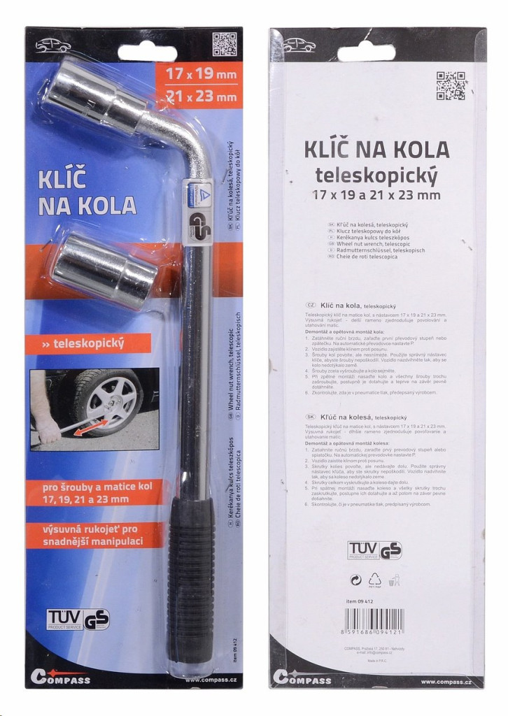 A teleszkópos L-alakú fém kulcs a Compass márkátólautó kerekek anyáik és csavarjaik lazítására / behúzására. A végére ráhelyezhető egy fej 17 / 19 és 21 / 23 mm mértekkel.
