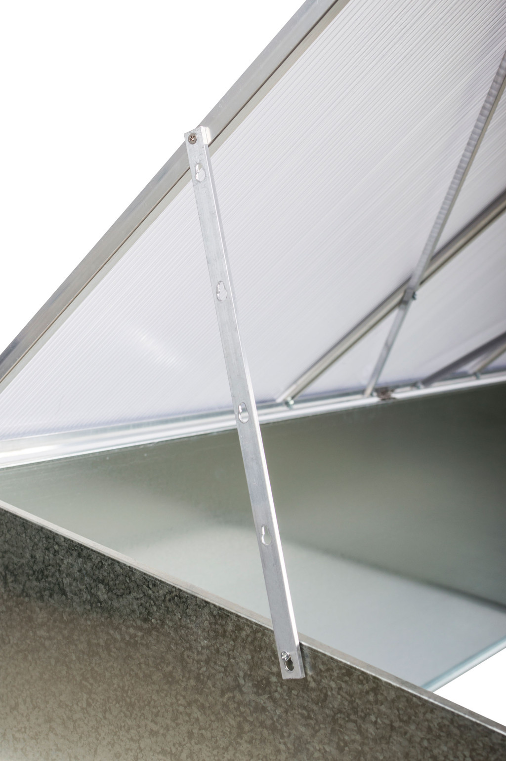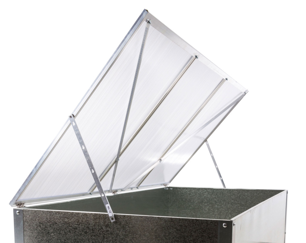 A felső alumíniumkeret 4 mm-es polikarbonát töltelékkel kényelmeshozzáférést biztosít az ültetéshez és a már elültetett növényekgondozásához.