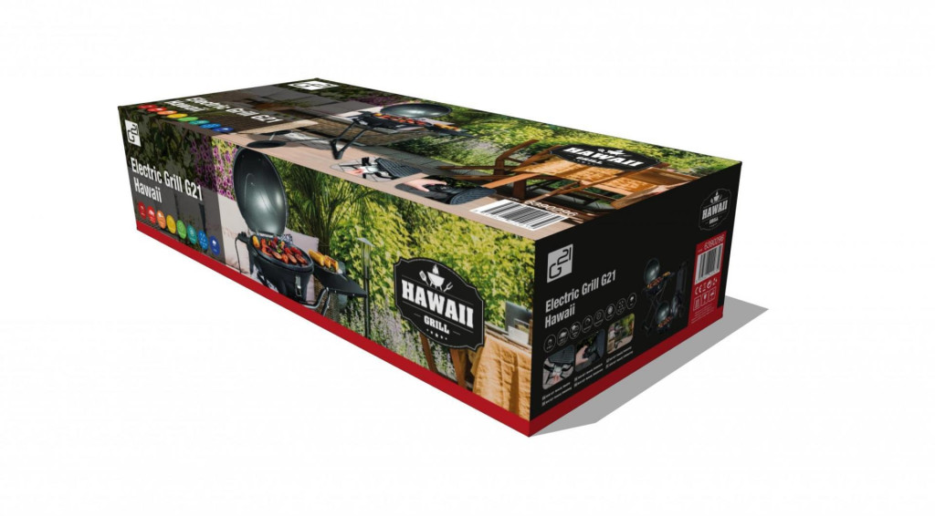 A G21 Hawaii elektromos grill, összecsukható asztallal és 2,4 kW teljesítménnyel, termosztáttal rendelkezik, 100 °C - 220 °C-ig állítható hőmérséklet tartománnyal. A hordozható girll nagy grillező felülettel és fedéllel, ötletesen kialakítotttároló hellyel és kerekekkel rendelkezik. Grillezés után a grill állványát könnyen összecsukhatja és az egész grillt kényelmesen és fáradozás nélkül áthelyezheti.