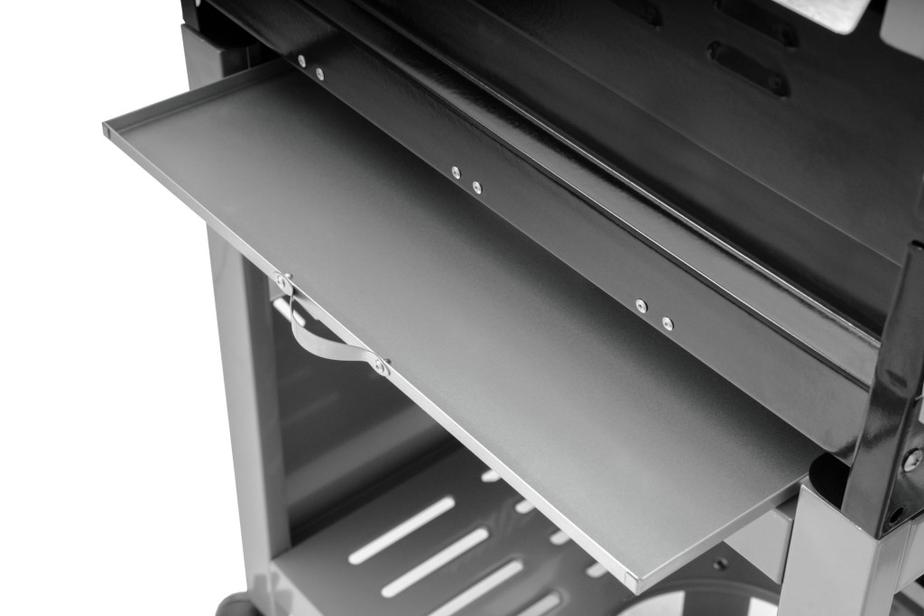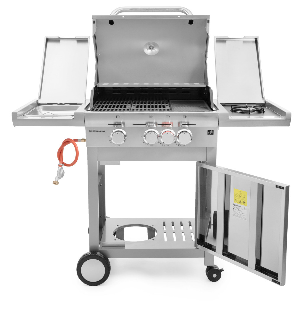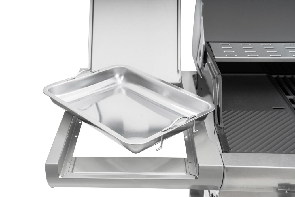 A kerti gázgrill egy csuklós fedéllel rendelkezik, mely lefedi az összes égőt,továbbá mindkét oldalán polcok találhatók.A bal polc alatt egy tárolóedény van, amelybe előkészítheti például a grillezni kívánt bepácolt húst.A jobb oldali polc alatt egy oldalsó égő található. A grill kiváló minőségű rozsdamentes acélból készül.