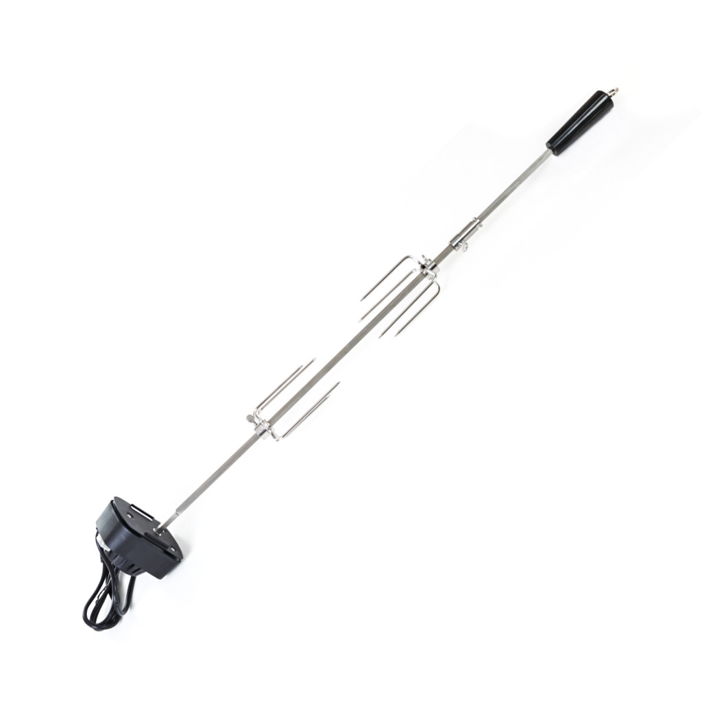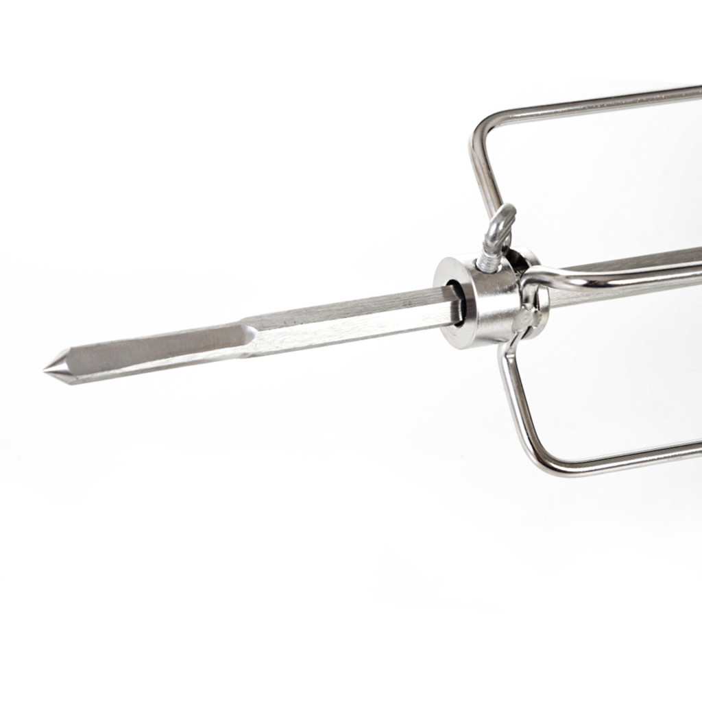 A motoros grillnyárs rozsdamentes acélból készül és mindkét oldalán négy tűvel van ellátva, rögzítő csavarokkal kiegészítve, amelyeknek köszönhetően a tűket saját igényei szerint állíthatja be.