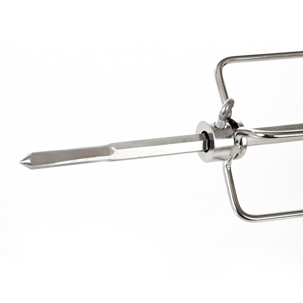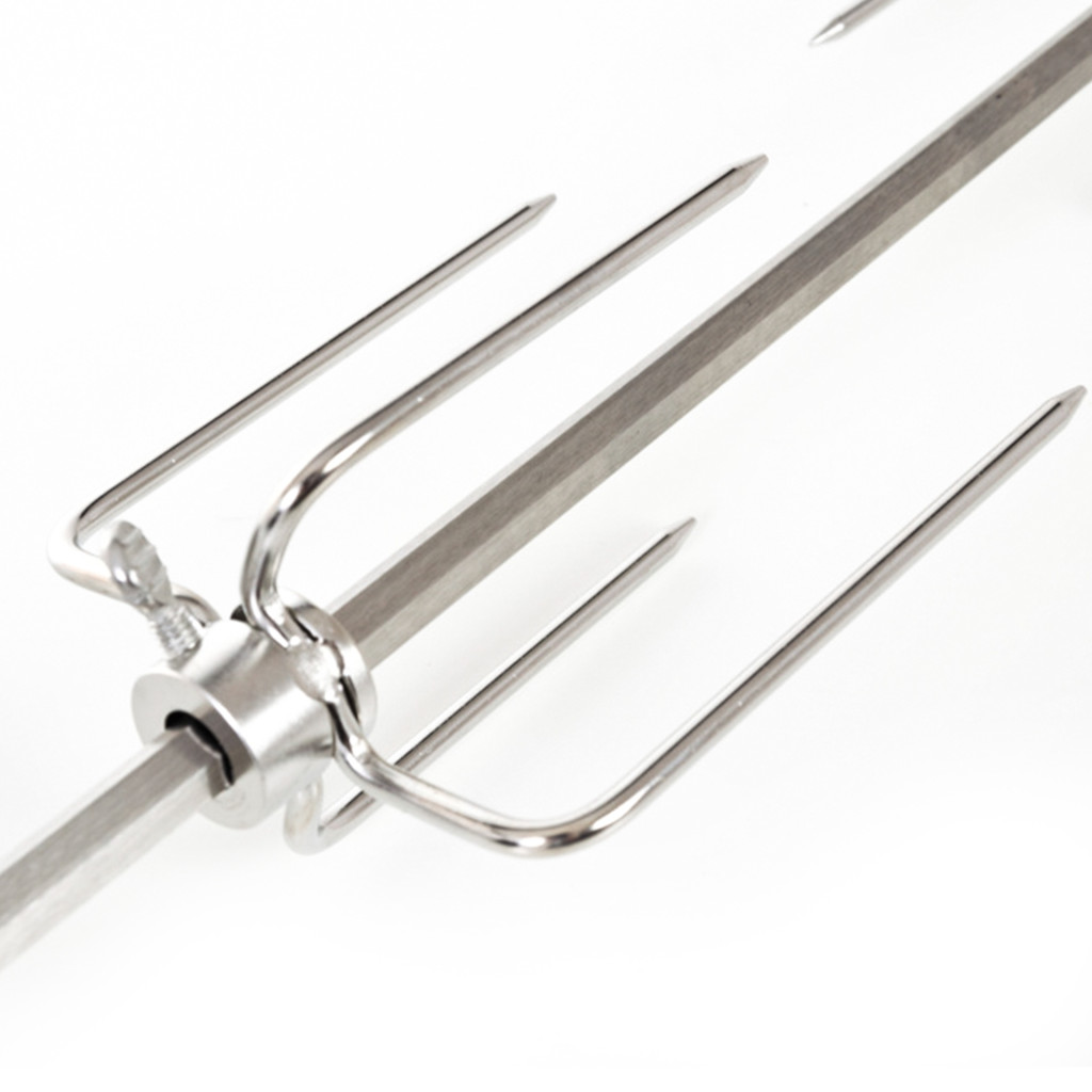 A motoros grillnyárs rozsdamentes acélból készül és mindkét oldalán négy tűvel van ellátva, rögzítő csavarokkal kiegészítve, amelyeknek köszönhetően a tűket saját igényei szerint állíthatja be.