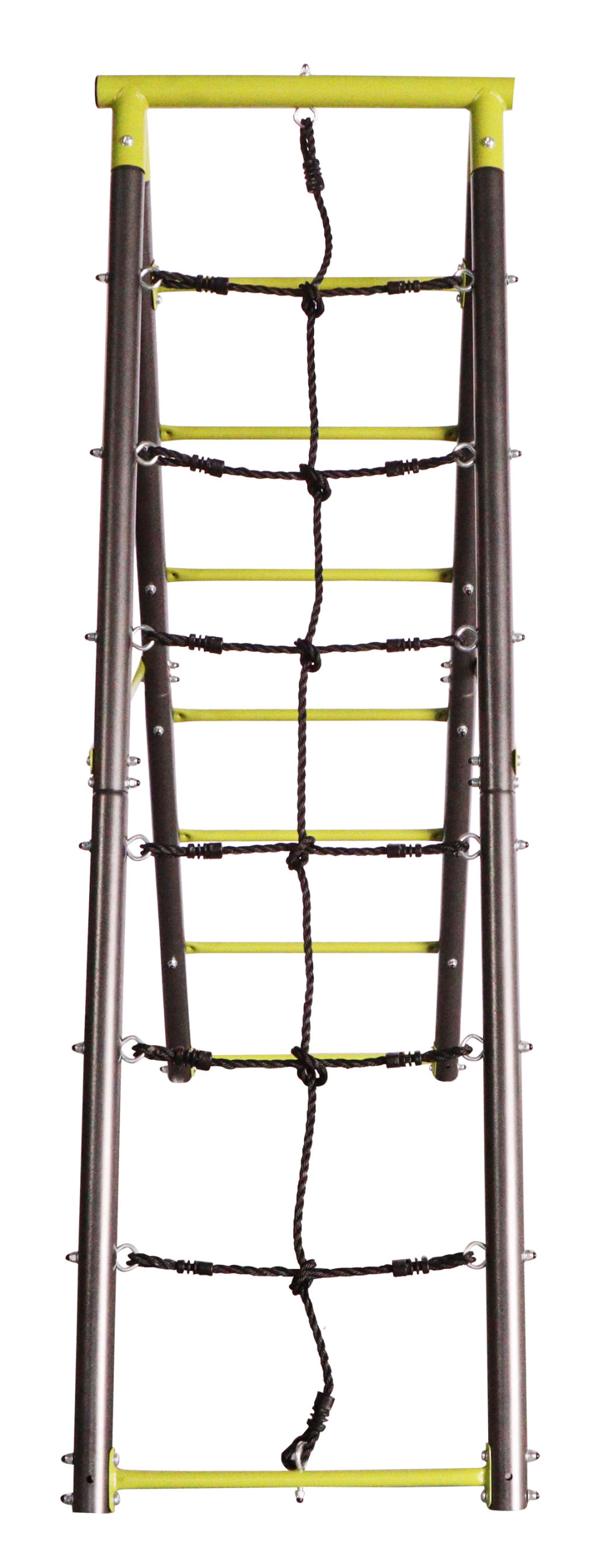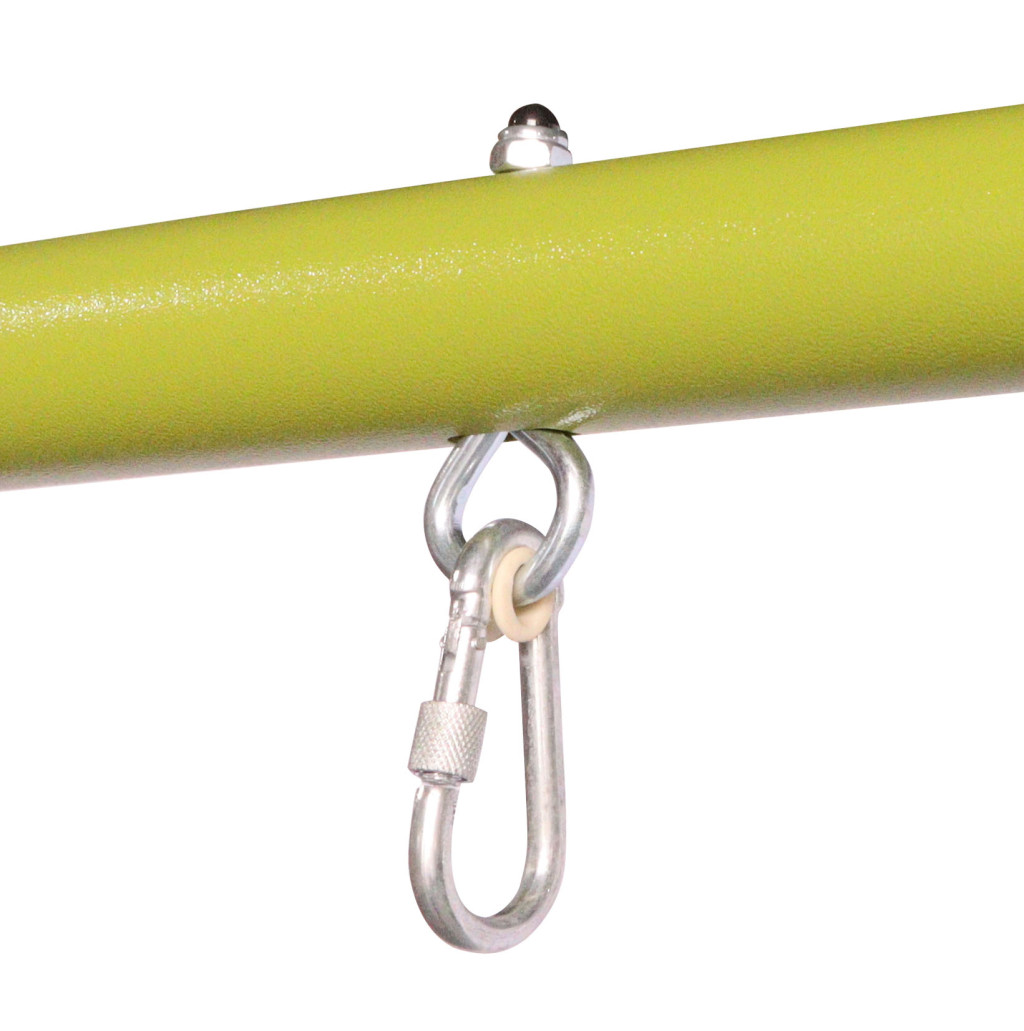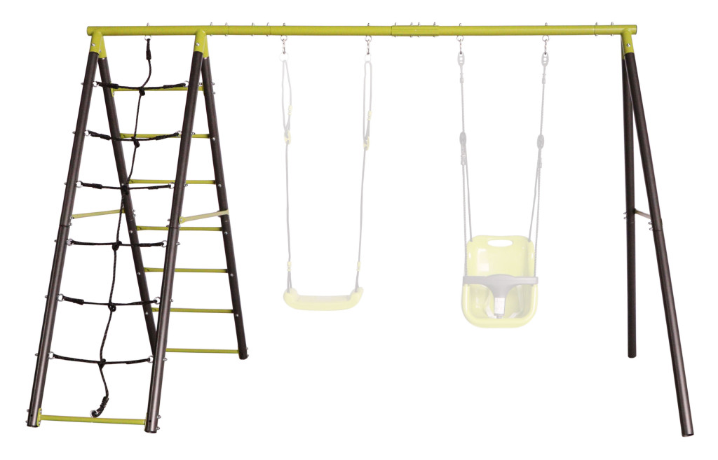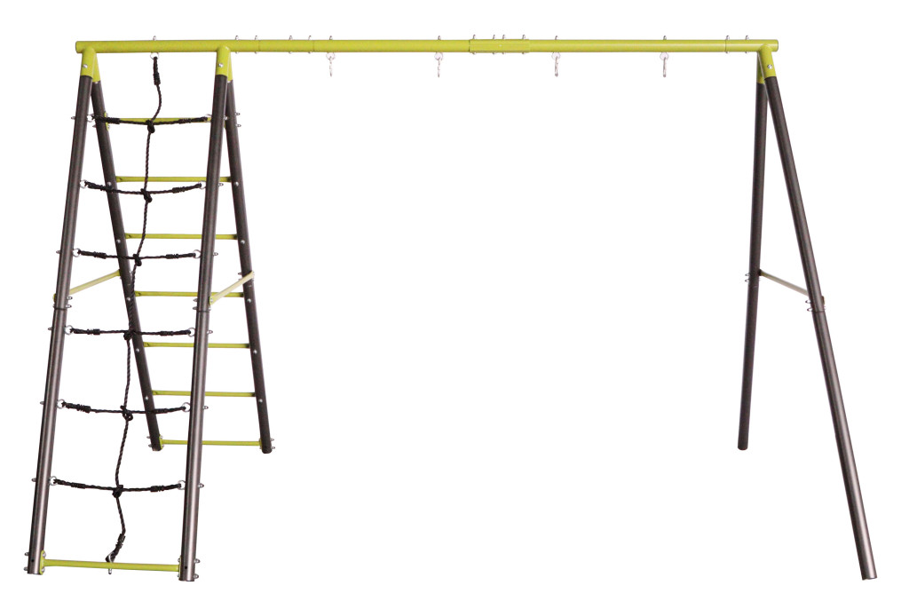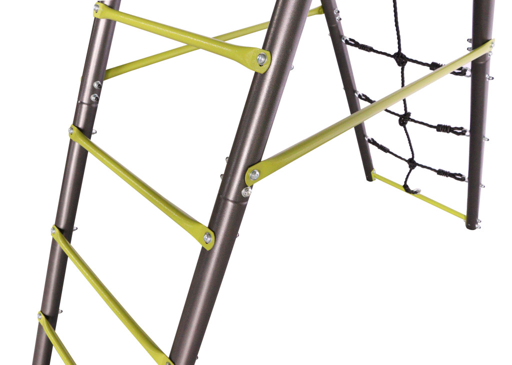 A fém fűzőlyukaknak köszönhetően könnyen felakaszthatsz rá hintákat kisgyermekeknek vagy hintaköröket. A két oldalsó támasz között egy létra és mászóháló található PE műanyagból, a harmadik támaszpár pedig készen áll egy csúszda rögzítésére. Biztonsági okokból a kerti hinta szerkezetét a talajhoz kell rögzíteni. A csomag ezért rögzítőhorgokat és a helyes és biztonságos rögzítéshez szükséges utasításokat is tartalmaz.