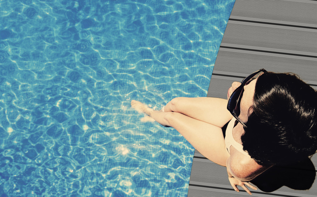 Egy nő a WPC terasz padlóburkolaton ülve medence mellett