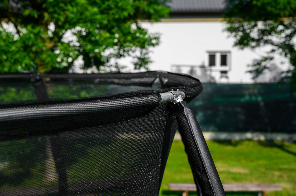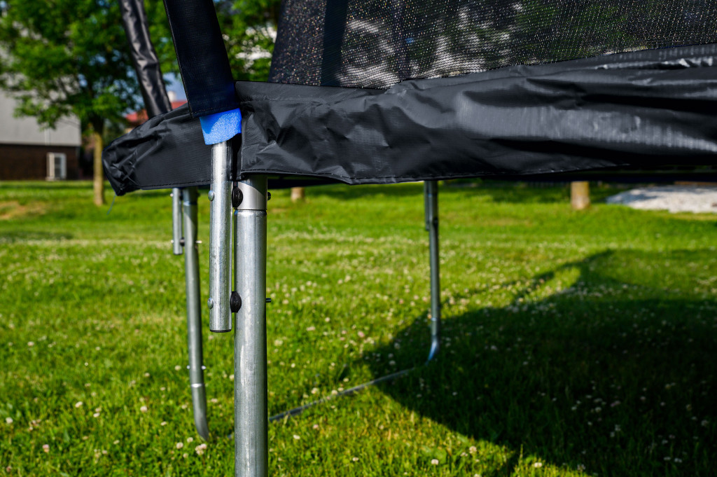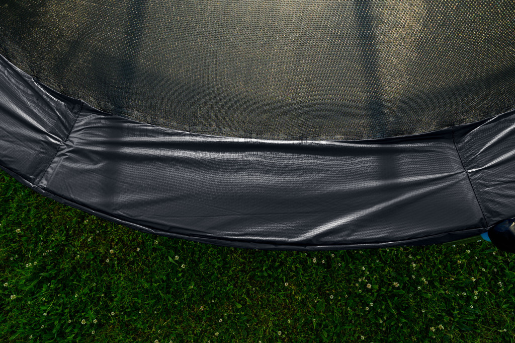 Nagy figyelmet fordítottunk a trambulin rugók megbízható burkolására is, hogy minimalizáljuk a sérülések kockázatát. A rugófedél tartós, vízálló anyagból készült, puha töltéssel. A trambulin oldalsó oszlopait vízálló, lágy habborítással vontuk be.