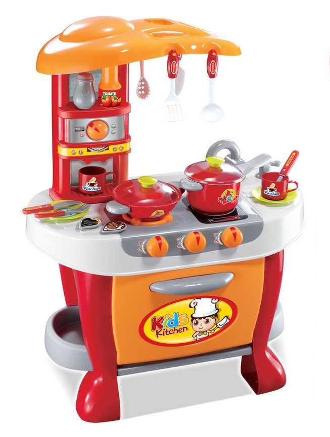 A G21 narancssárga gyerek konyha sütővel, két főzőlappal, mosogatóval, tároló felülettel, konyhai kellékekre való akasztóval és sok egyéb felszereléssel van ellátva. Hang és fényjelzés a főzőlap bekapcsolásánál. 31 db edény és egyéb felszerelés.