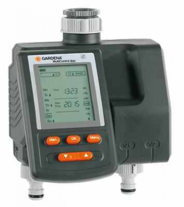 Comfort modell, napi max.3 öntözési programmal, 2 öntözési kör automatikus öntözéséhez. A nagy kijelző segíti az egyszerű és gyors programozást. A kezelőfelület levehető, könnyen kézben tartva programozható. 9V-os elemmel használható. Üzemidő kb. 1év. 3/4" és 1" vízcsapra szerelhető. Üzemi nyomás: 0,5-12bar.Naponta 3 öntözés lehetséges, melyek időtartama 1perc - 3óra 59perc között szabadon beállítható. Öntözési napok szabadon választhatóak. Eső- és talajnedvesség érzékelővel vezérelhető külön-külön mindkét kör. Elem töltöttség kijelzővel.