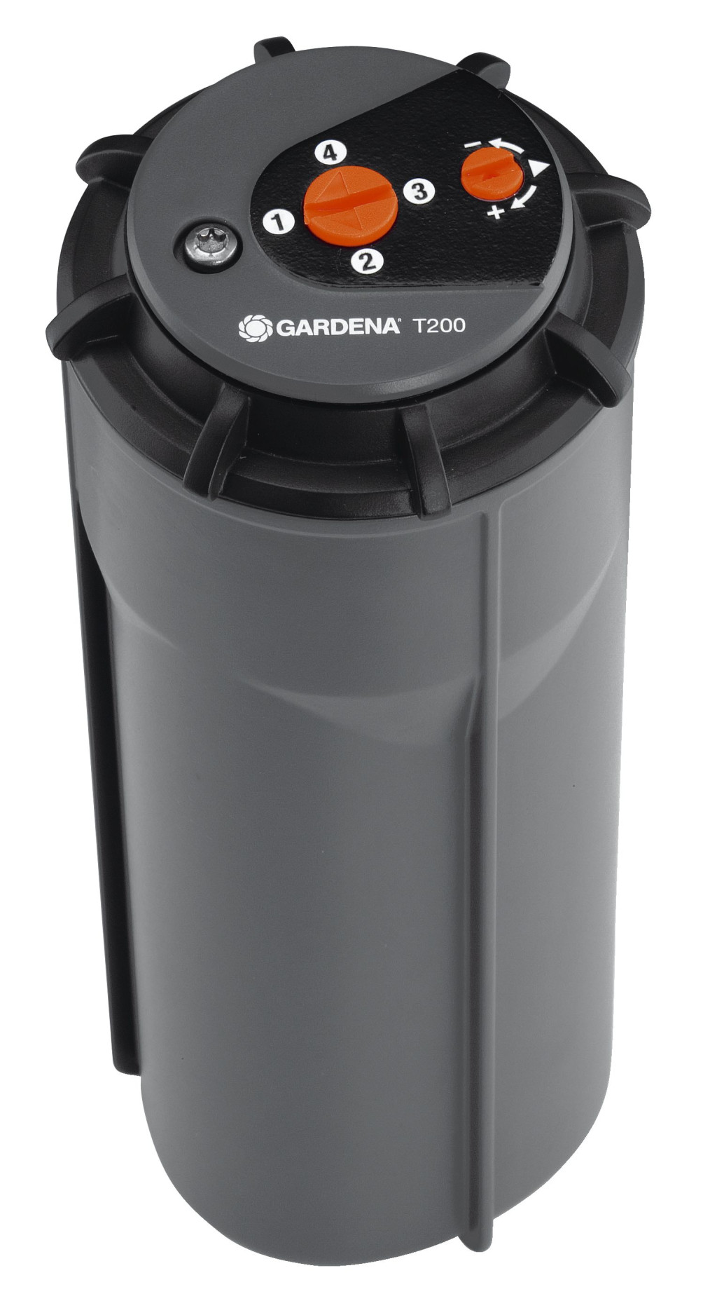 GARDENA Sprinklersystem részét képező GARDENA T 200 turbinás esőztető kitűnően alkalmas a közepes méretű gyepfelületek öntözésére 200 m2-ig. A T 200 turbinás esőztető kombinálható a T 100 és 380 turbinás esőztetővel (cikkszám: 8201-29 és 8205-29), valamint az OS 140 süllyesztett négyszögesőztetővel (cikkszám: 8220). Hatótávolsága 5 és 8 m között állítható, a felületnek megfelelően. Az esőztetőfejen a 25-360° tartományban fokozatmentesen - szerszám nélkül - lehet beállítani a kívánt öntözési szektort. A beöntözött felületet a legkisebb szektortól a teljes körig bármilyen rész alkothatja. Memóriafunkciója révén az esőztető automatikusan visszatér az előre beállított szektor öntözéséhez, még az esőztetőfej szándékos elforgatása esetén is. Ennek köszönhetően az eszköz mindig a megfelelő felületet fogja öntözni. Az öntözés rugalmassága érdekében négy különböző vízátfolyású fúvóka közül lehet egyszerűen választani az egyedi öntözési szektor alapján. Különböző szektorbeállítású esőztetők együttes használata esetén ez különösen fontos az egyenletes öntözés érdekében. A beépített szennyszűrő megszakításmentes működést tesz lehetővé. A megbízható, homoktűrő turbinás meghajtás hosszú élettartamot biztosít. A csővezetékbe víztelenítőszelepet (cikkszám: 2760-20) telepítve, a Sprinklersystem fagyállóvá tehető. A csatlakoztatás 1/2" méretű belső menettel történik.