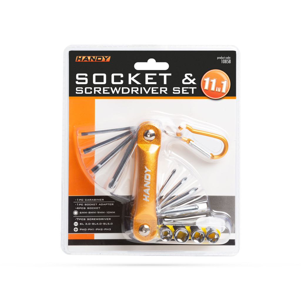Legyen mindig kéznél a segítség! Kompakt, kihajtható csavarhúzó szárakat és dugókulcsokat tartalmazó készlet. A praktikus kulcskarikának és karabínernek köszönhetően könnyen rögzíthető akár táskán, szerszámtartó övön, kerékpáron is. A készlet 7 csavarhúzót és 4 dugókulcsot tartalmaz a megfelelő adapterrel.
