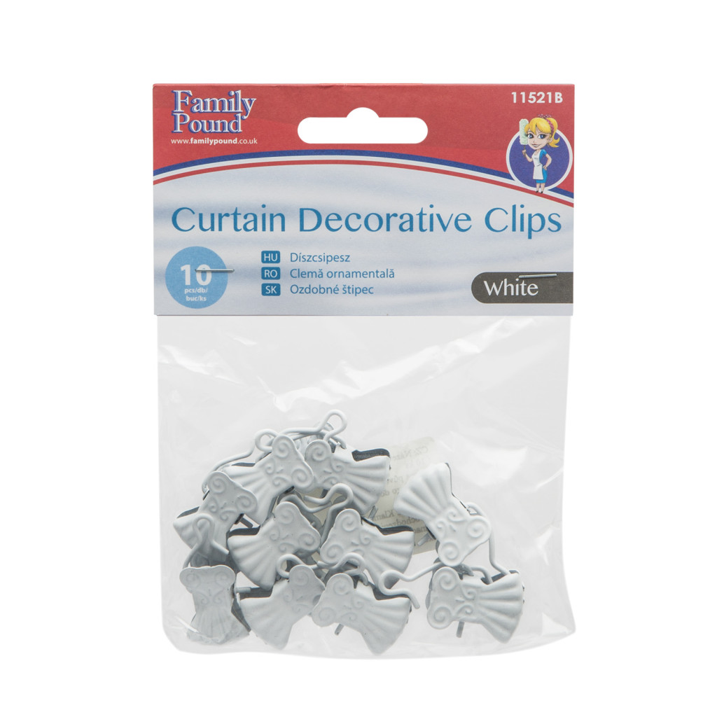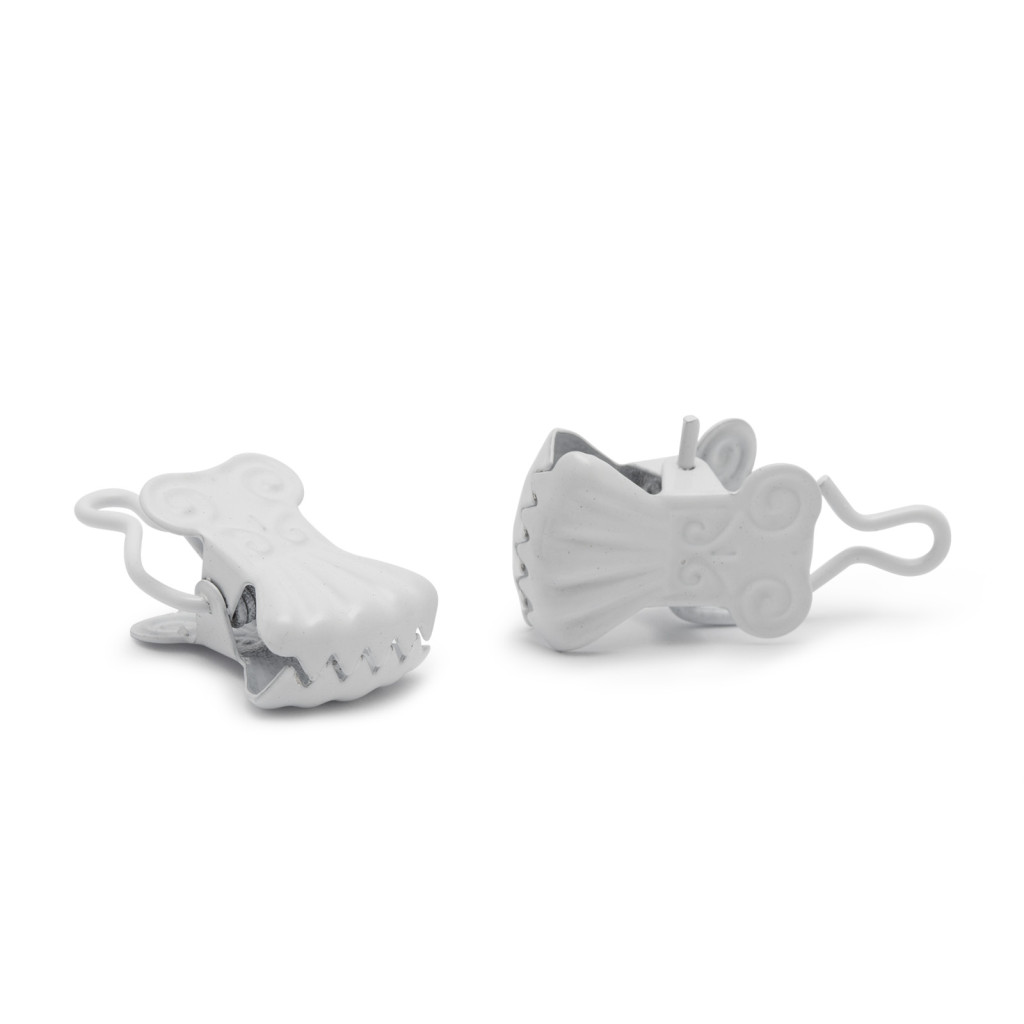 Kampós díszcsipesz függönyökhöz. A fehér fém csipesz elegánsá teszi a fehérszín harmóniát. Nem üt el a fehér karnistól vagy a fehér függönytől. Görgő nélkül.