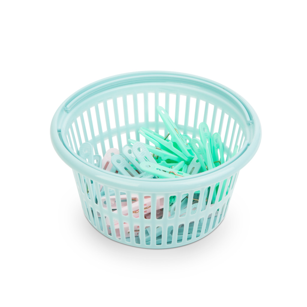 Színes, műanyagból készült csipesz szett praktikus, füllel rendelkező tároló kosárral.