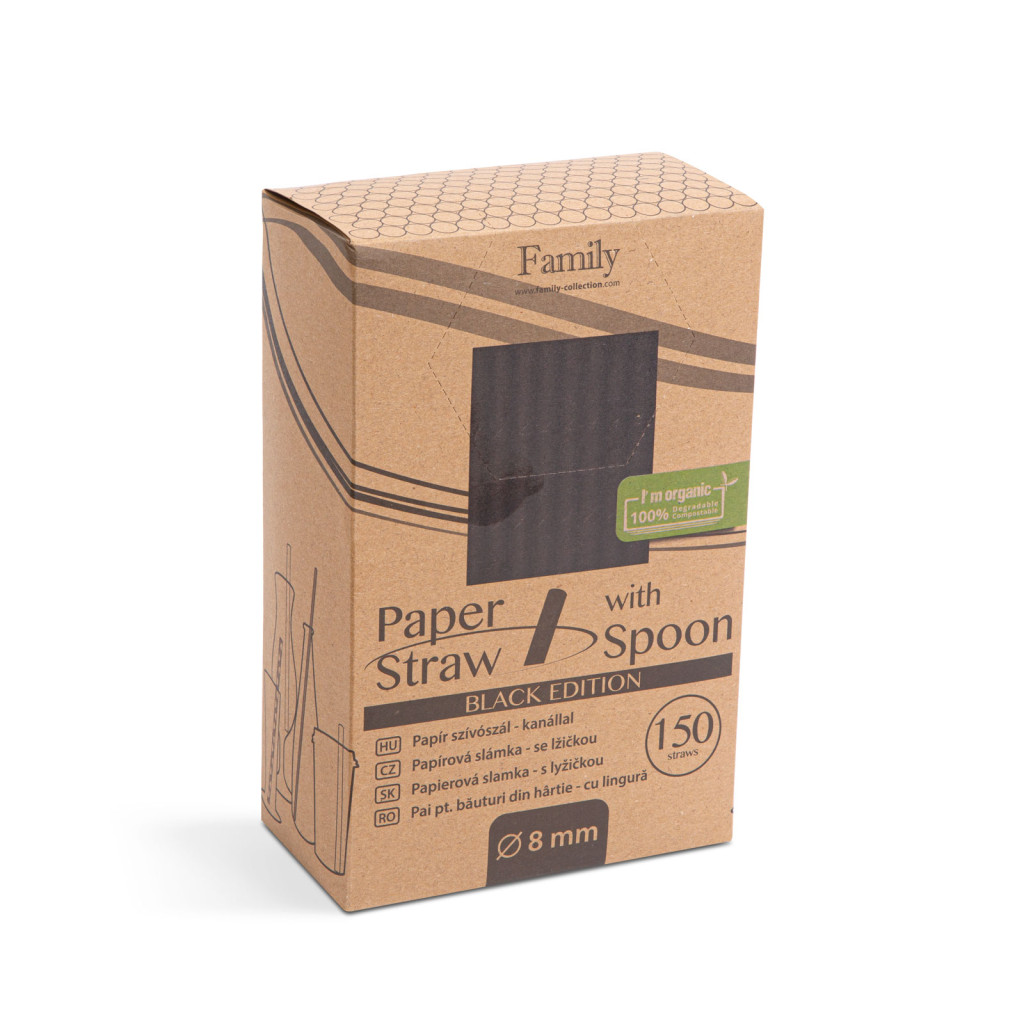 Papír szívószál - fekete, kanállal - 200 x 8 mm - 150 db / csomag