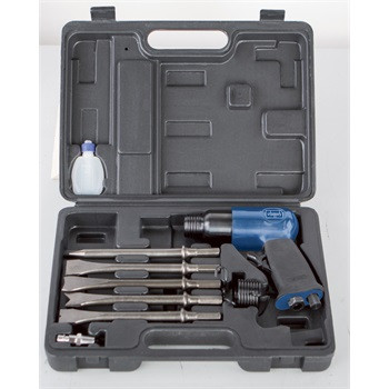 Vésőkalapács készlet és tartozékok praktikus kofferban. Ideális falazati nyílások, vájatok és átmenő furatok képzéséhez, lemezek szétválasztásához, csempék vagy vakolatok leveréséhez, szegecsek eltávolításához, stb. Ütések száma: 4.500 /perc Üzemi nyomás: 6,3 bar Levegőszükséglet: 79,2 l /perc Vésőszár átmérő: 10 mm Acélváz kivitel, csúszásgátló markolat Tartozékok: 5 db véső, zsírzógomb, olaj, gyorscsatlakozó, feszítőrugó Súly és méretek Súly (kg): 1.20 Méretek: Magasság (m): 150.00 Hosszúság (h): 145.00 Szélesség (sz): 45.00