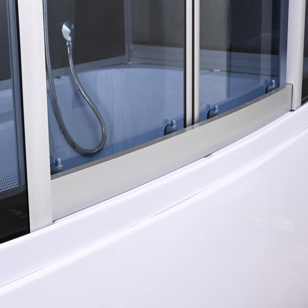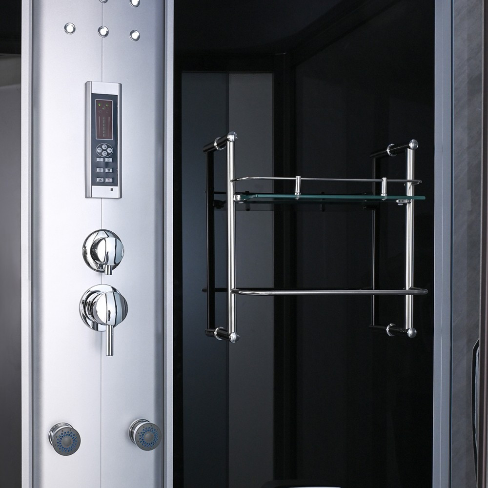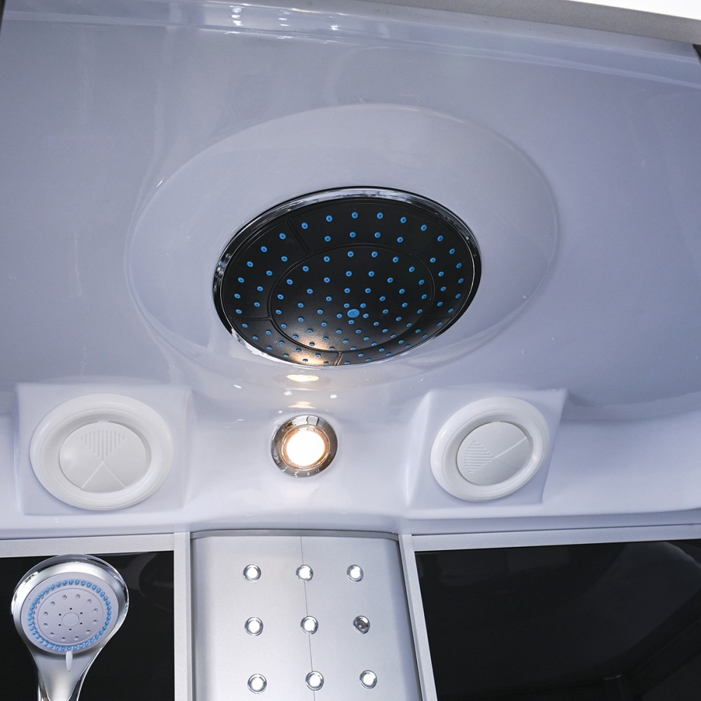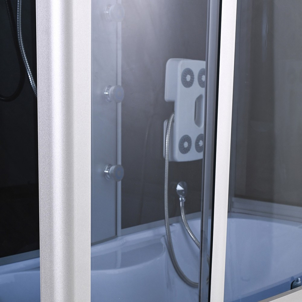 A kabint 5 mm vastag edzett biztonsági üveg veszi körül, amely sötétszürke fix üveg- és ajtópanelekkel, illetve fekete üvegfalakkal fokozza az esztétikai megjelenést. A matt króm vezetősínek és profilok tovább emelik a termék eleganciáját, míg a matt króm funkciópanel a vezérlési lehetőségek középpontjában áll. A kabin 6 hidromasszázs fúvókával rendelkezik, amely garantálja az egész testet átölelő masszázsélményt, miközben a beépített rádió, ventilátor, LED háttérvilágítás és felső világítás tovább fokozza a relaxáció élményét.