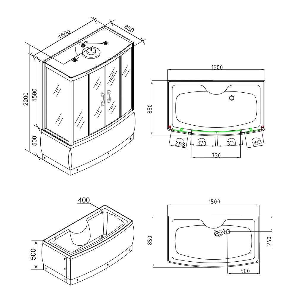A kabint 5 mm vastag edzett biztonsági üveg veszi körül, amely sötétszürke fix üveg- és ajtópanelekkel, illetve fekete üvegfalakkal fokozza az esztétikai megjelenést. A matt króm vezetősínek és profilok tovább emelik a termék eleganciáját, míg a matt króm funkciópanel a vezérlési lehetőségek középpontjában áll. A kabin 6 hidromasszázs fúvókával rendelkezik, amely garantálja az egész testet átölelő masszázsélményt, miközben a beépített rádió, ventilátor, LED háttérvilágítás és felső világítás tovább fokozza a relaxáció élményét.