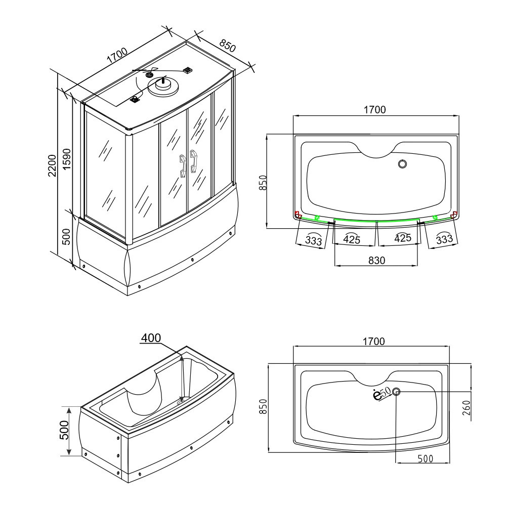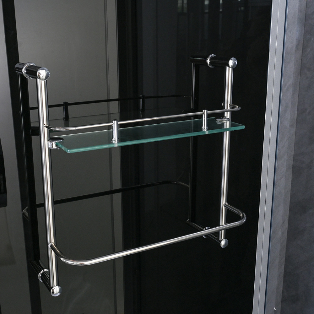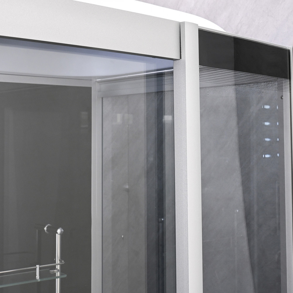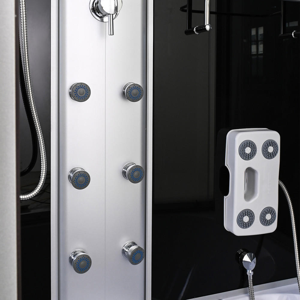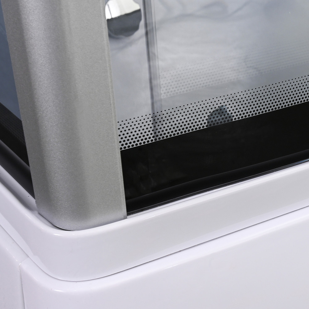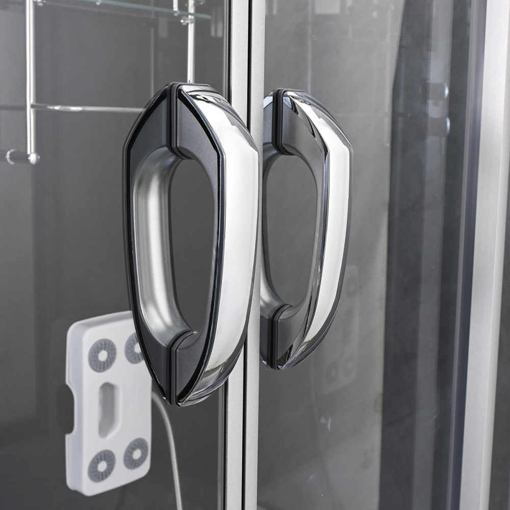A kabint 5 mm vastag edzett biztonsági üveg veszi körül, amely sötétszürke fix üveg- és ajtópanelekkel, illetve fekete üvegfalakkal fokozza az esztétikai megjelenést. A matt króm vezetősínek és profilok tovább emelik a termék eleganciáját, míg a matt króm funkciópanel a vezérlési lehetőségek középpontjában áll. A kabin 6 hidromasszázs fúvókával rendelkezik, amely garantálja az egész testet átölelő masszázsélményt, miközben a beépített rádió, ventilátor, LED háttérvilágítás és felső világítás tovább fokozza a relaxáció élményét.