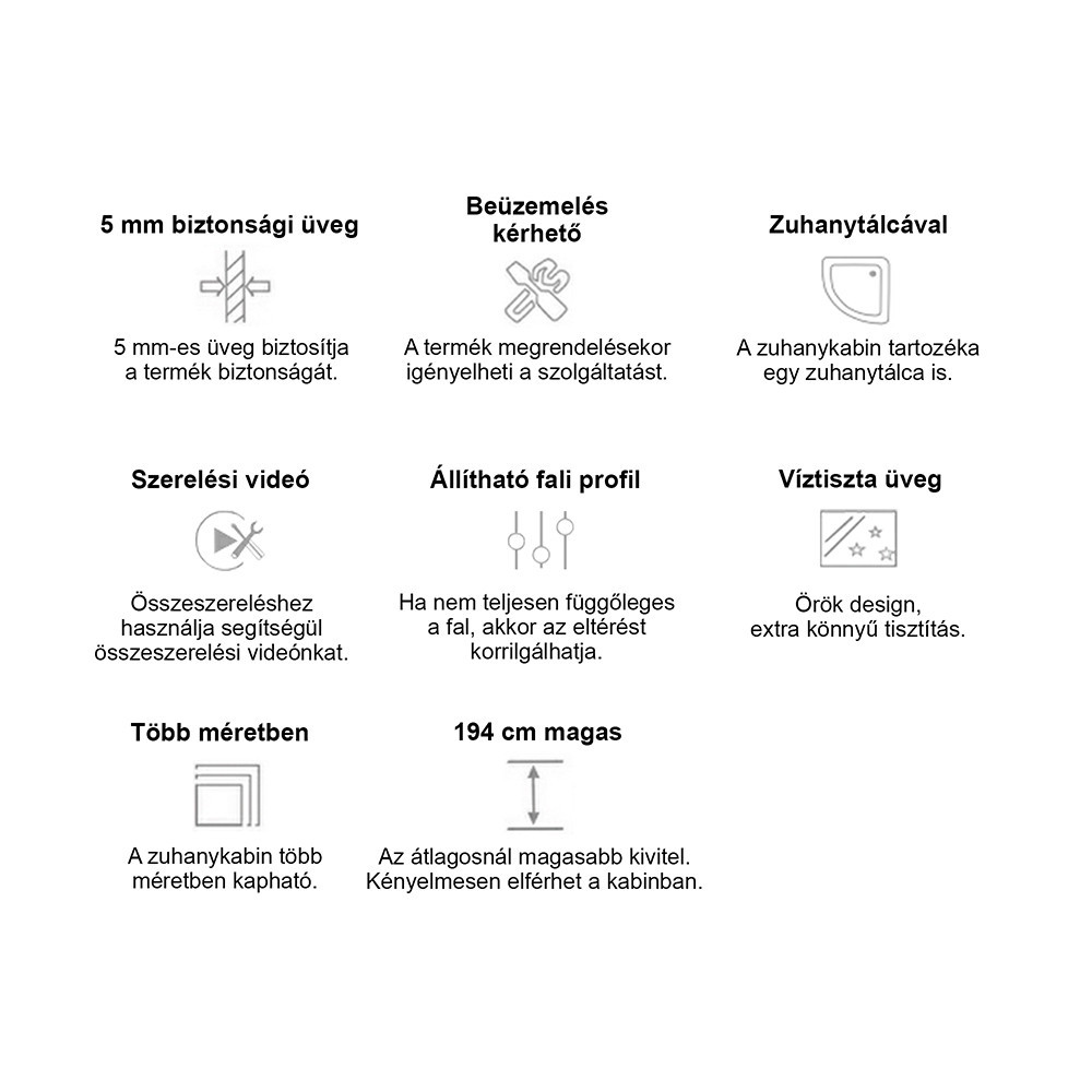 Az állítható fali profil rugalmas szerelhetőséget tesz lehetővé, így az esetlegesen nem teljesen függőleges falakhoz is pontosan illeszthető a kabin. A felső és alsó sínek extra stabilitást biztosítanak, míg a vízvető profilok megakadályozzák a víz kiszivárgását. Ez a konstrukció különösen előnyös panel- vagy régi építésű lakásokban, ahol a falak gyakran eltérnek a szabványos derékszögtől.