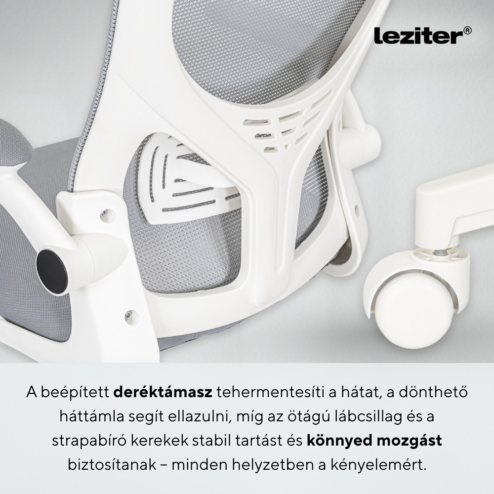 A hálós anyagból készült háttámla biztosítja a szellőzést. A levegőáramlás segít megőrizni a komfortérzetet anélkül, hogy izzadtságfoltokkal vagy fülledt érzéssel kellene megküzdeni.