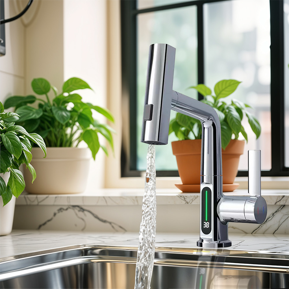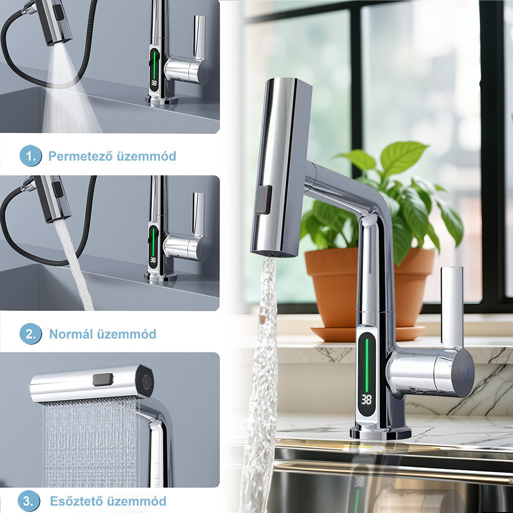 Van digitális hőmérséklet kijelző a csaptelepen? Igen, a csaptelep beépített digitális hőmérséklet kijelzővel rendelkezik, amely pontosan mutatja a víz hőmérsékletét különböző színekkel jelezve: kék (0-30°C), zöld (30-40°C) és piros (40-49°C).