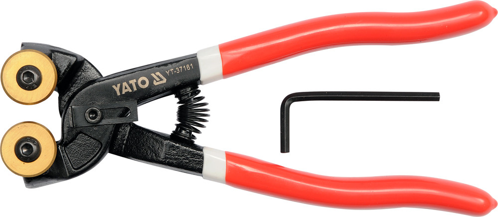 Precíziós fogó a YATO-tól, lemezek darabjainak letöréséhez. a vágóelem kör alakú yg-6x karbidból készült késekből áll, amelyeket tovább keményítenek titán-nitrid / arany színű bevonattal. a késeket az tengelyen lehet forgatni, hogy az anyaggal érintkező részek mindig élesek legyenek